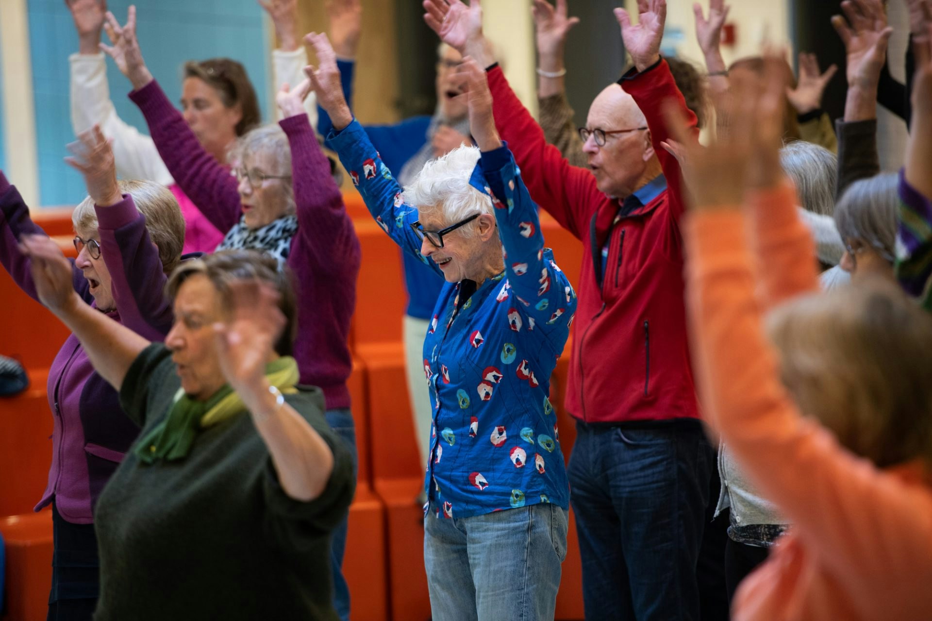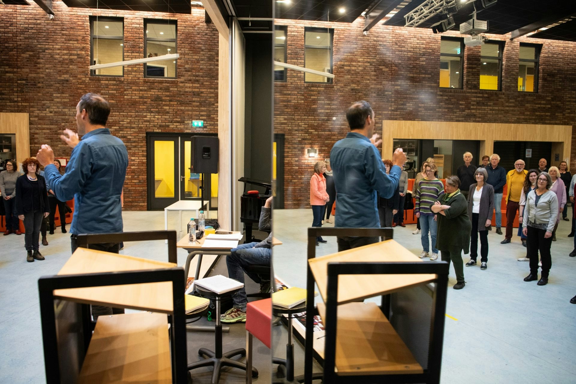 “Hulde, hulde, driewerf hulde”, klinkt het op maandagavond – deze ene keer in de aula van een middelbare school in Vianen, normaal gesproken in Utrecht. Het koor van stadsopera Trijn is aan het repeteren. Het begint even daarvoor met een ietwat rumoerige zaal; mensen komen net van de eettafel naar de repetitie en hebben zo te zien na het weekend wel wat met elkaar te bespreken. Nadat dirigent Roel Vogel enkele keren in zijn handen klapt, verstomt het gebabbel en komen de koorleden op het geïmproviseerde podium staan. De dirigent neemt zijn plaats op de verhoging en kijkt de koorleden aan. Een akkoord op de piano geeft het startschot voor het inzingen: “Ja-ja, ja-ja, ja-ja, ja-ja-jaaa.”
