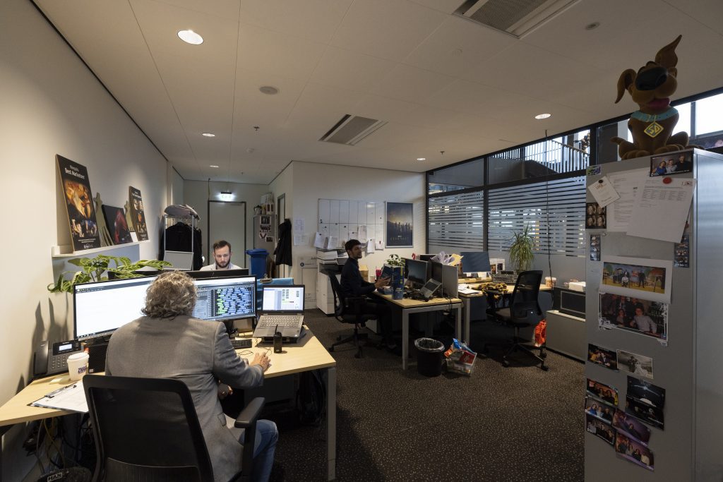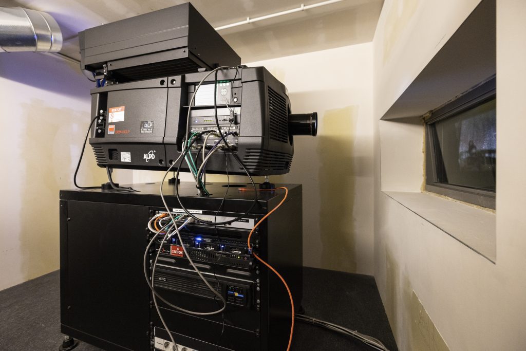“Nederland was relatief snel met het innoveren van de techniek in de bioscopen”, zegt Jacco van de Ruit. Hij is theatermanager bij Kinepolis Jaarbeurs Utrecht. Hij trekt een zware, zwarte deur open. Daar staat een kolossaal apparaat, van ongeveer een vierkante meter groot. Aan de zijkant branden groene lampjes. Bovenop zitten twee laserprojectoren, die een filmtrailer op het witte doek creëren. “Hier staat de apparatuur die alles regelt voor het afspelen van de film. Alles hier is geautomatiseerd: het instarten van de trailers, het dimmen van de lichten in de zaal en het afspelen van de film. Het beeld dat iemand op de afspeelknop komt drukken, dat is wel een jaar of 15 à 20 oud.”