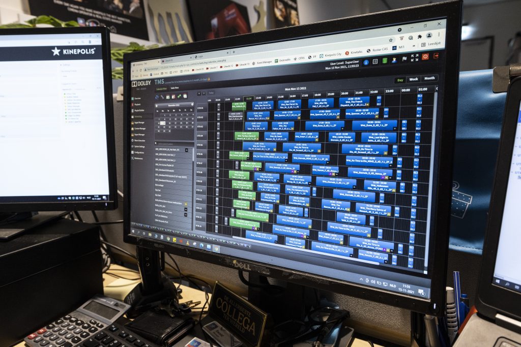 “Alle projectoren worden één keer per week door één persoon geprogrammeerd”, legt Van de Ruit uit. “Die zet er dus ook meteen de trailers voor en zorgt dat de lichten aan het begin van de film dimmen.” Binnenkort is er voor de Kinepolis-bioscopen nog minder werk te doen voor de filmvertoningen. “Over niet al te lang wordt het nog verder geautomatiseerd; dan hoeft ook het programmeren van de films niet meer. Het hele programma, inclusief trailers en lichten, wordt dan in één keer vanuit het hoofdkantoor ingeladen.”