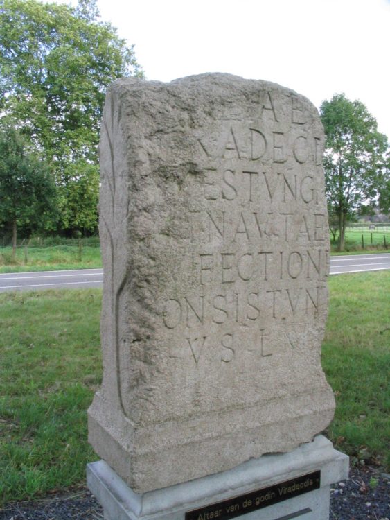 Bewijzen van die handel zijn ook in Utrecht te vinden. Vandaag liep ik nog langs de fraaie getuigenis die al jaren langs de provinciale weg naar Bunnik staat. Valt hij u eigenlijk wel eens op? Het gaat om een replica van een altaar voor de godin Viradecdis, opgericht door schippers uit Tongeren en gevonden bij Fort Vechten. Aangezien rondom Tongeren (nu in Belgisch Limburg) graanteelt voorkwam, neemt men aan dat die schippers graan naar de omgeving van Fectio brachten. Het vrij vochtige rivierlandschap bij ‘ons’ was waarschijnlijk minder geschikt voor spelt en broodgraan. Dat werd daarom gehaald uit gebieden waar het wel groeide. De komst van de Romeinen leverde dus contacten met tal van delen van het Rijk. En toen het stof van strijd en opstand eenmaal neergedaald was, volgde er lange eeuwen van vrede en voorspoed onder Romeinse heerschappij.