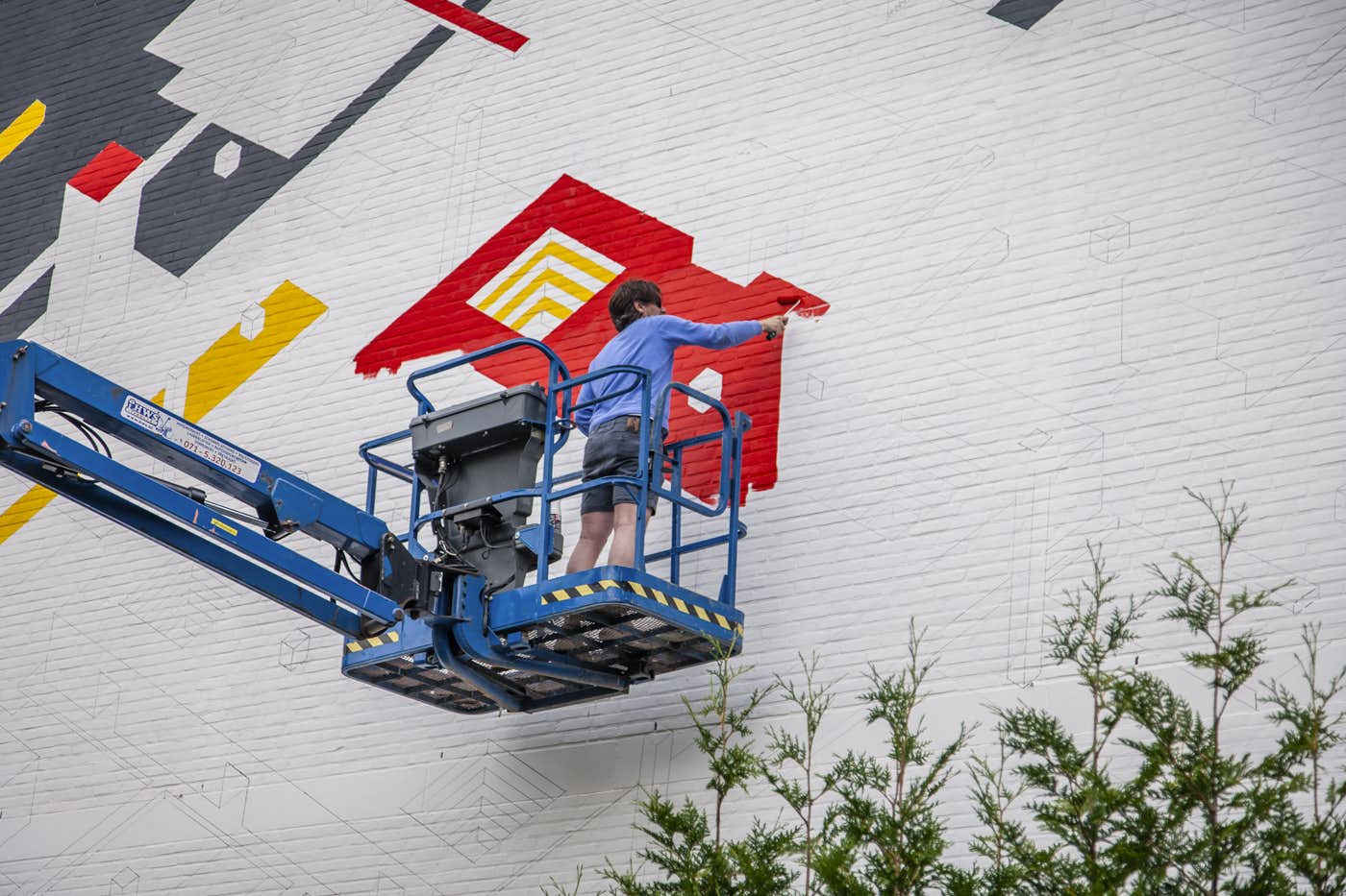 Kunstenaar Johan Moorman laat zich inspireren door kunstenaars van De Stijl, zoals de bekende Piet Mondriaan en Gerrit Rietveld. “Deze stroming is de basis bij ieder ontwerp”, vertelt hij. Met behulp van een hoogwerker en een medeschilder hoopt hij het kunstwerk binnen een paar dagen af te hebben.