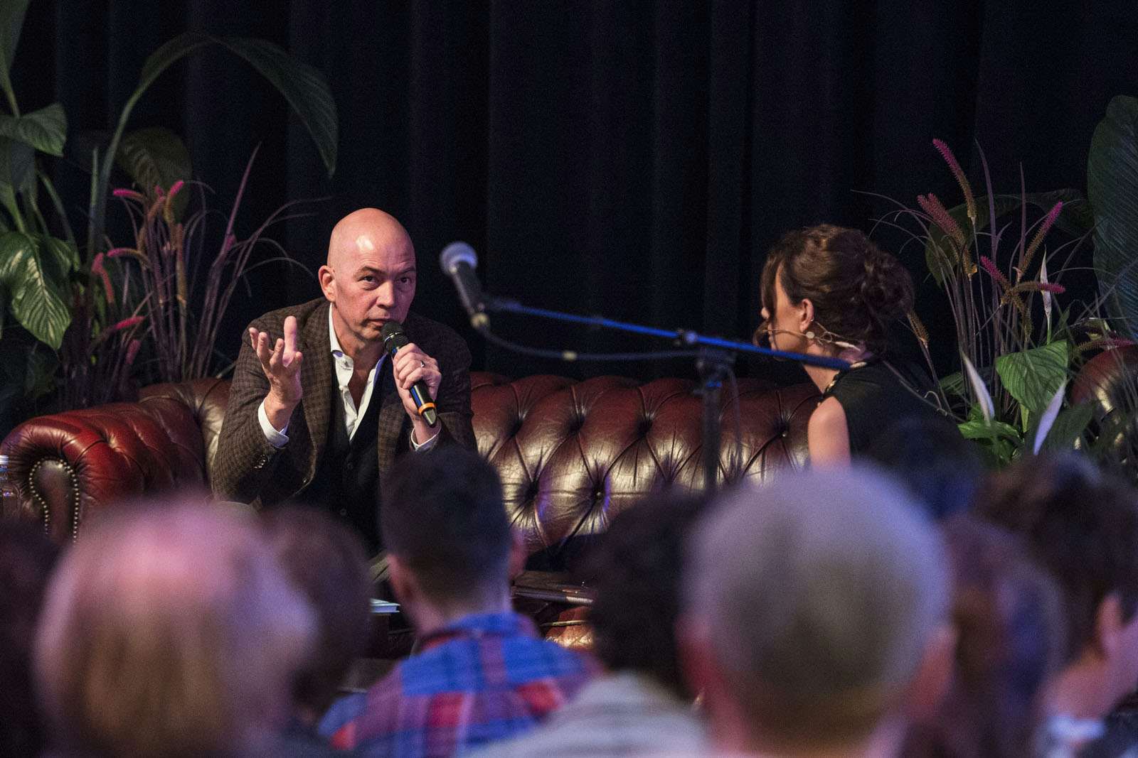 Als het hoofdprogramma eindelijk begint en Wieringa wordt aangekondigd, ontstaat er onder de voor mij zittende leden van een leesclub enige deining. ‘Wat een lekker ding,’ zegt een van de vrouwen. De dame naast haar maakt een foto met haar telefoon en zucht diep. Ondertussen bewerkt Tommy de zaal met zijn zalvende stem, als een masseur die een vrouw met een zere rug langzaam los kneedt.