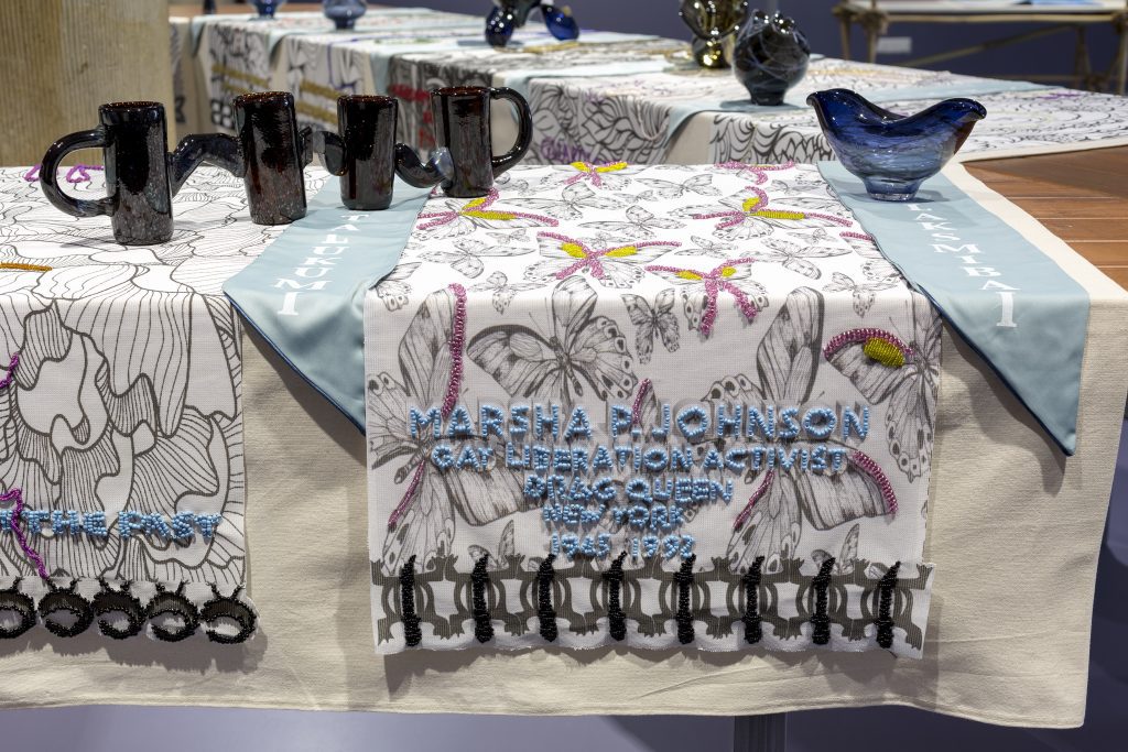 Glaswerk en geborduurd tafellinnen moeten de zestig vrouwen symboliseren. Voor het borduren van de namen op het linnen, roepen de musea de lokale gemeenschap op. Zo borduren de deelnemers samen aan een versie van de installatie.