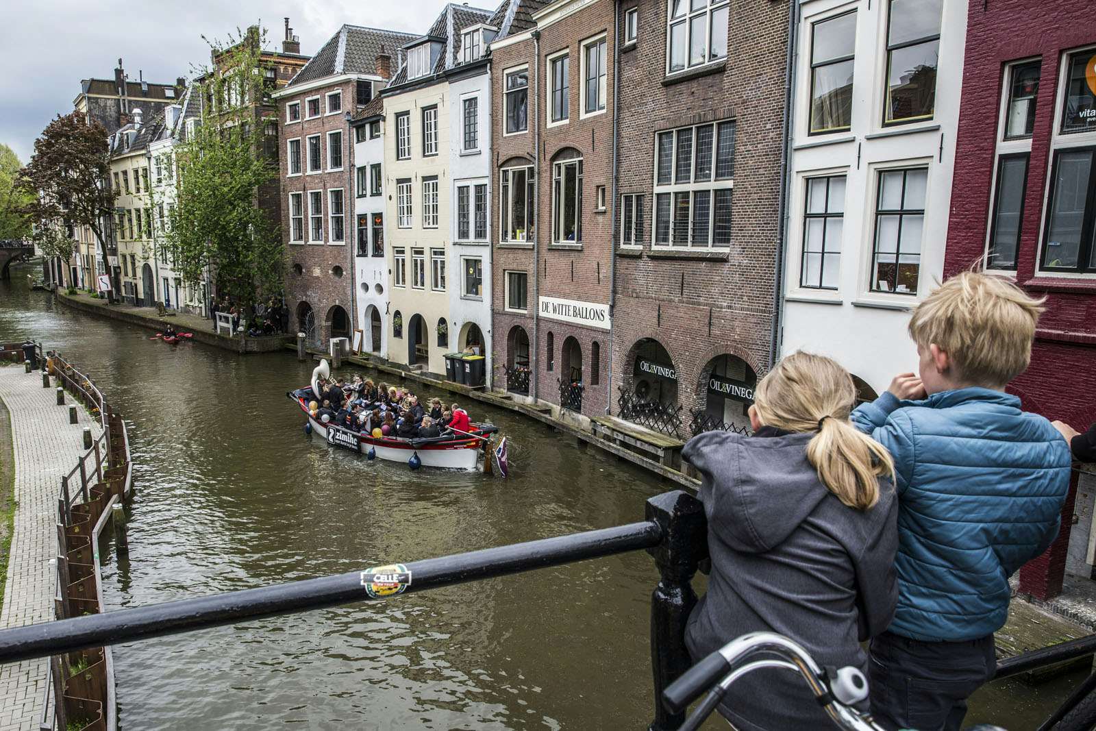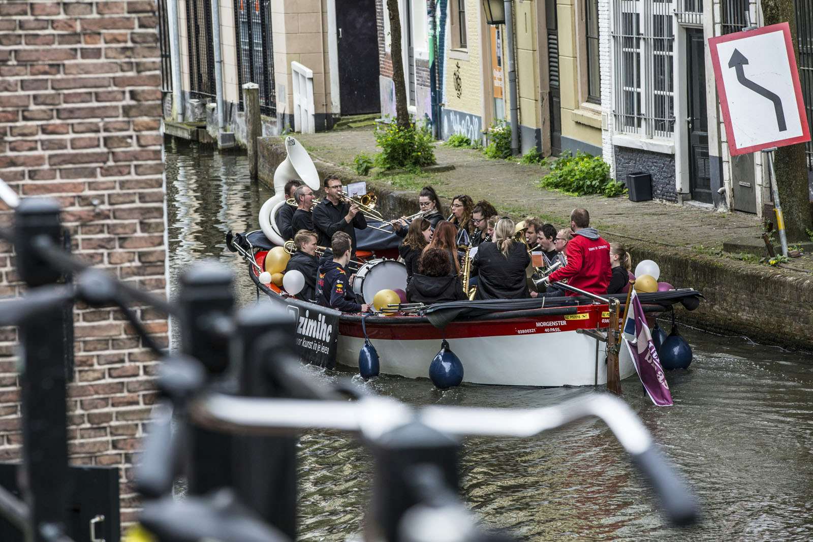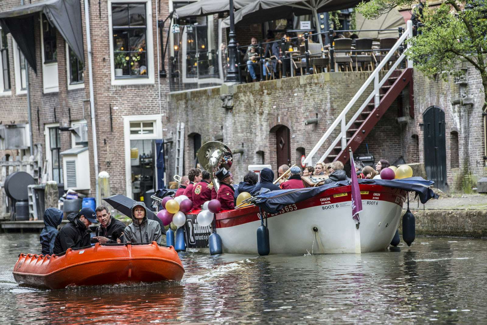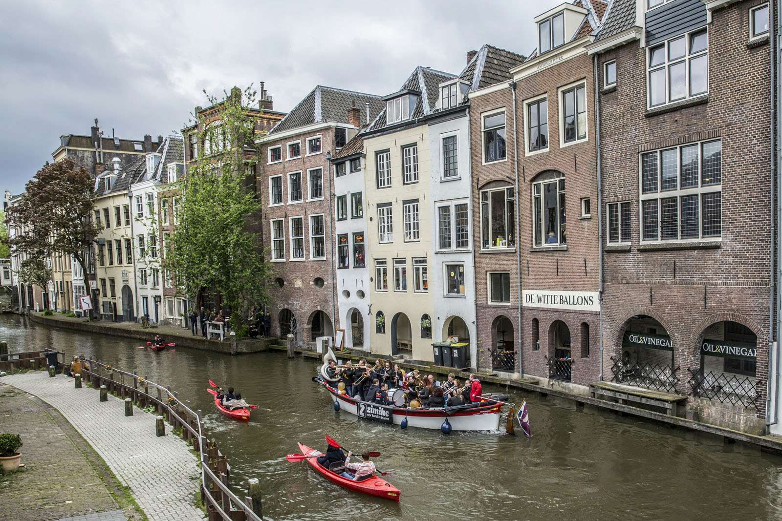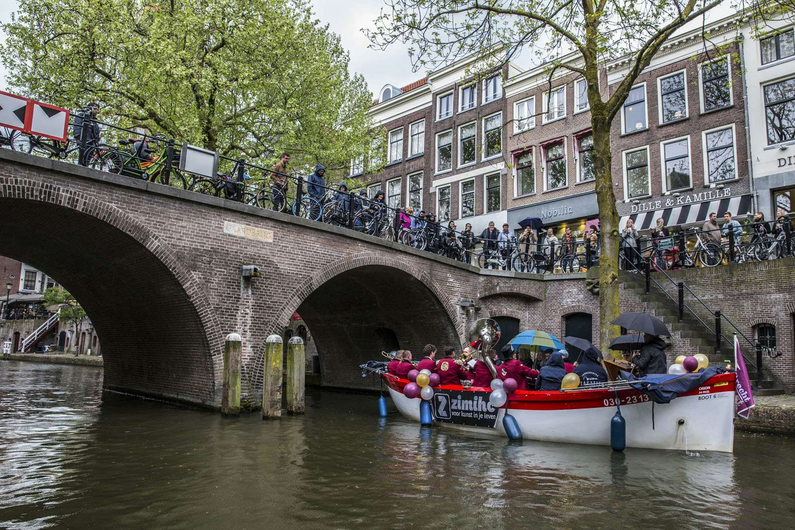 Bezoekers van de Utrechtse binnenstad werden vanmiddag getrakteerd op gratis concerten. Zowel op de Stadhuisbrug als vanaf een sloep die op-en-neer over de Oudegracht voer klonken swingende jazz-geluiden.
