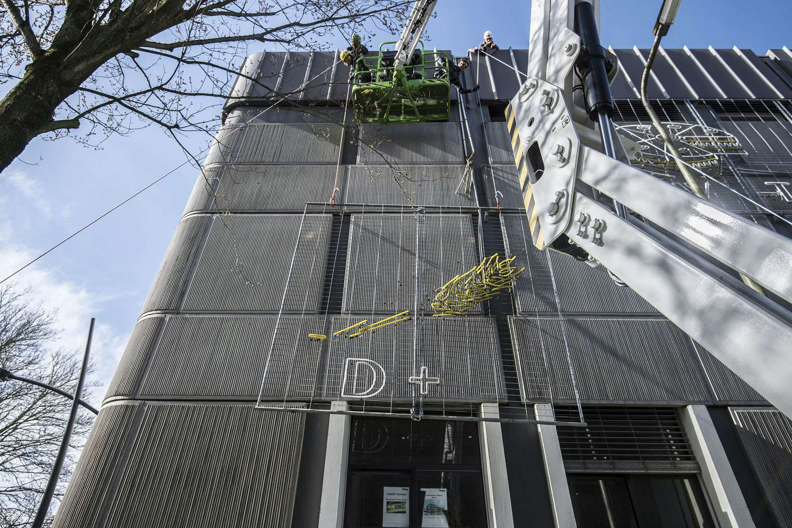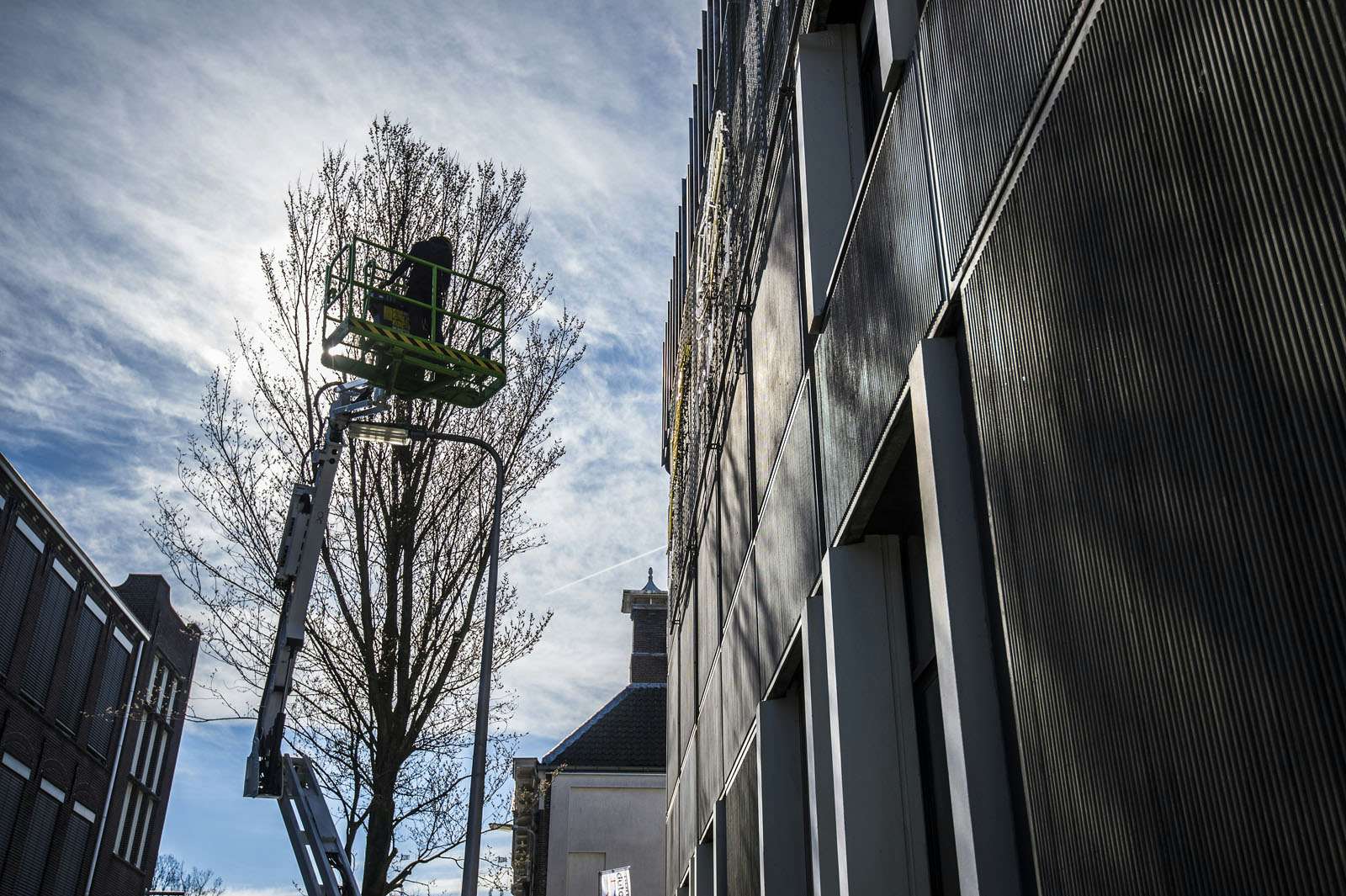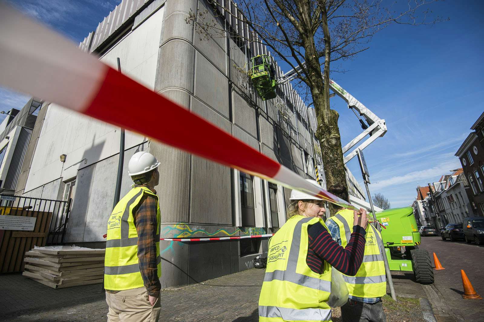 Een groep vrijwilligers is vandaag druk bezig met het verwijderen van de neon-rebus van de gevel van het Woudagebouw aan de Lange Nieuwstraat. Het pand in het centrum van Utrecht wordt grotendeels gesloopt om plaats te maken voor een nieuw appartementencomplex. Enkele Utrechters hebben zich ontfermd over het kunstwerk en zijn op zoek naar een nieuwe plek voor de neon-letters.