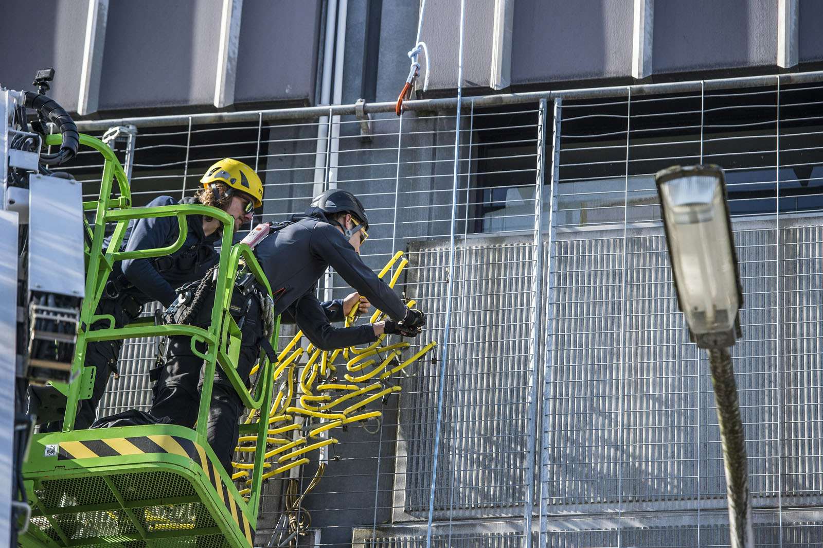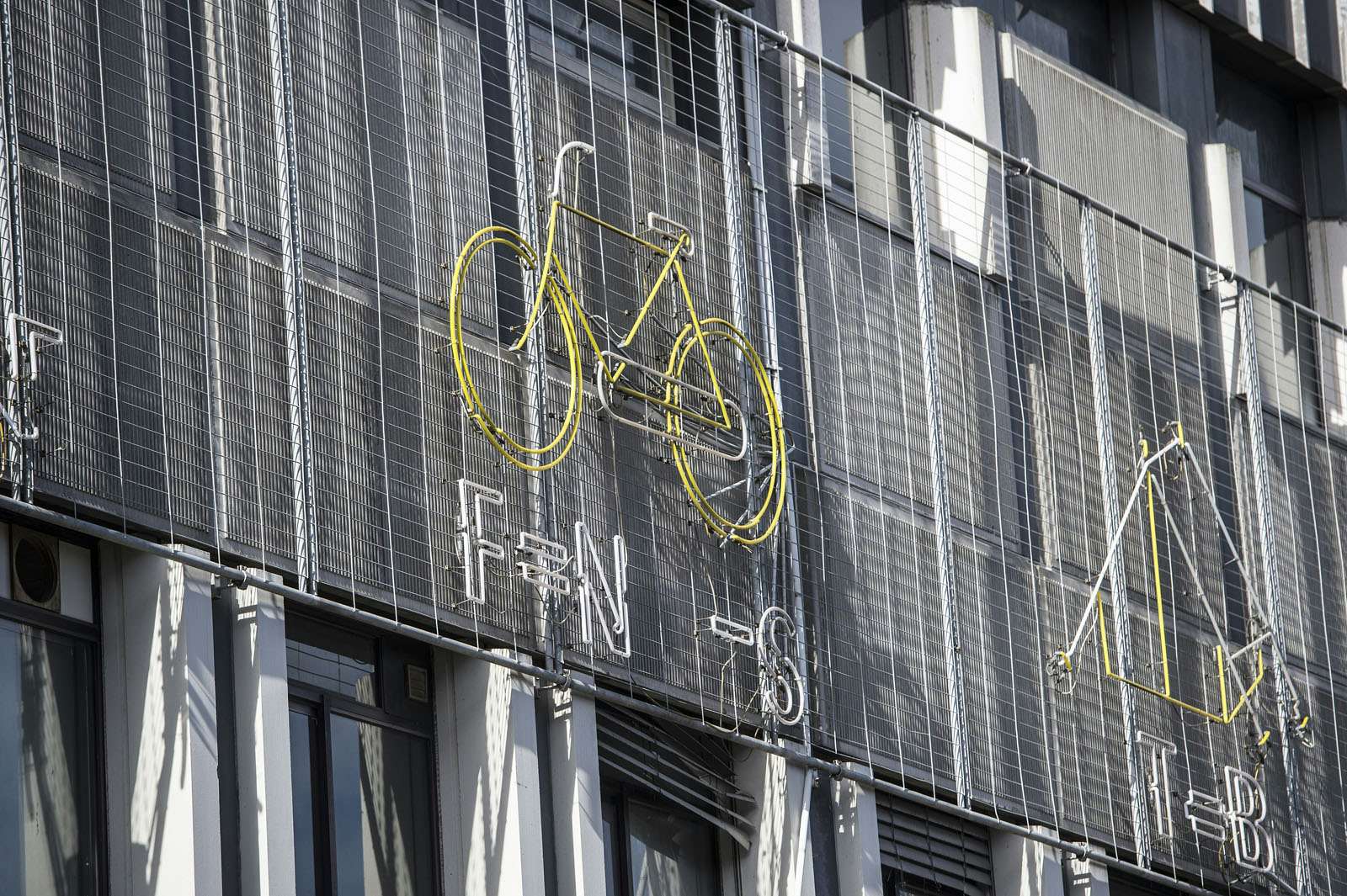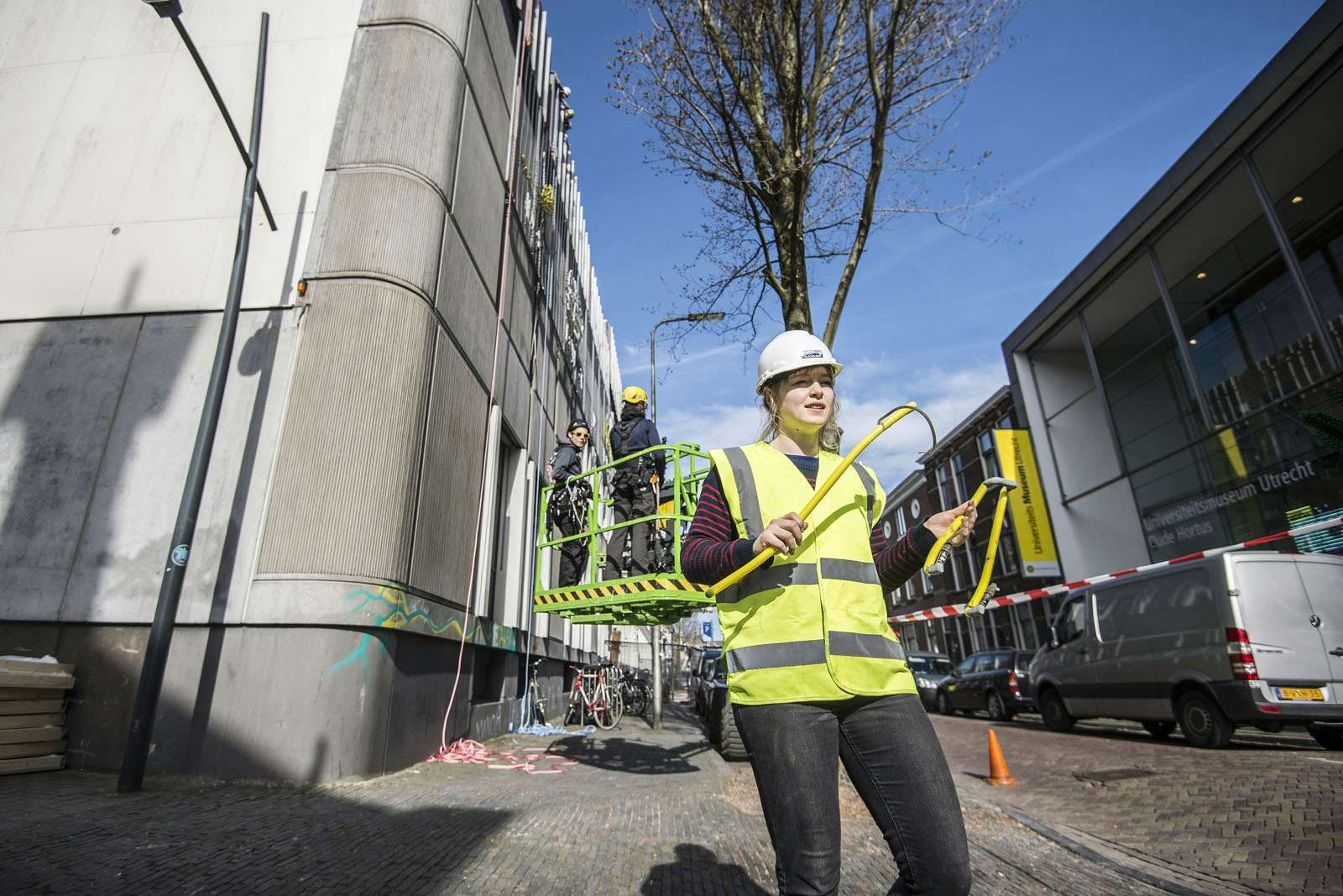 Een groep vrijwilligers is vandaag druk bezig met het verwijderen van de neon-rebus van de gevel van het Woudagebouw aan de Lange Nieuwstraat. Het pand in het centrum van Utrecht wordt grotendeels gesloopt om plaats te maken voor een nieuw appartementencomplex. Enkele Utrechters hebben zich ontfermd over het kunstwerk en zijn op zoek naar een nieuwe plek voor de neon-letters.