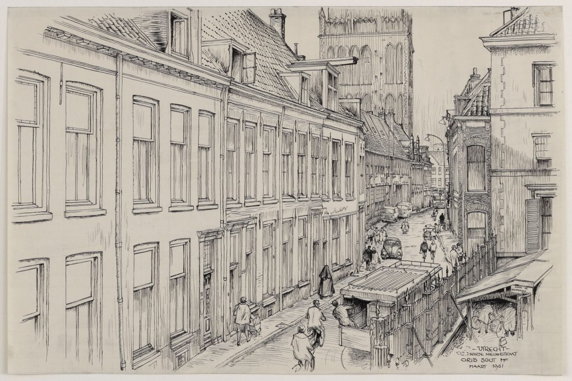 In 1961 had de gemeente Utrecht grote plannen: er moest meer ruimte voor de auto komen in de binnenstad. Ook de Korte en de Lange Nieuwstraat moesten eraan geloven. Met de komst van het gemotoriseerde verkeer werd de smalle straat een probleem. Dat is mooi te zien op onderstaande tekening die Chris Schut in maart 1961 maakte. Je ziet hier auto’s, vrachtverkeer, fietsverkeer, voetgangers en in de verte een stadsbus; dat was af en toe behoorlijk dringen.