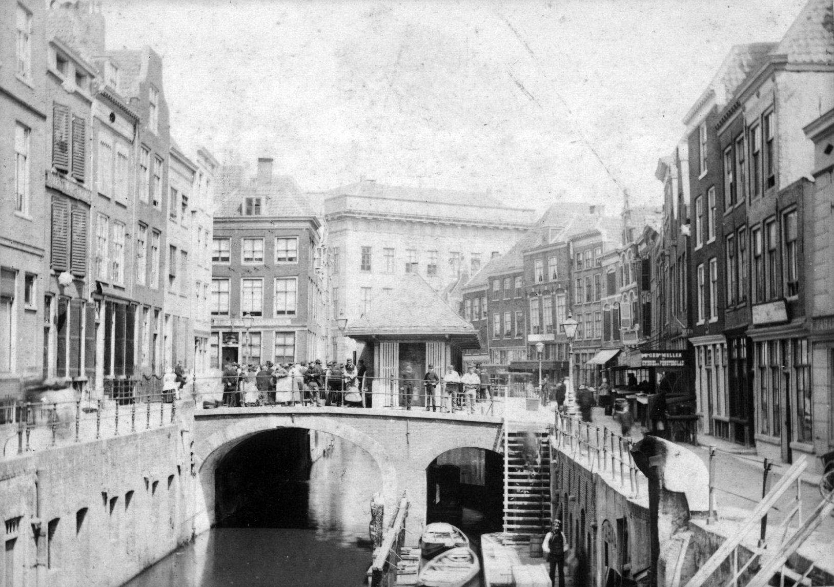 Anthony Grolman keek in 1891 vanuit een raam op de tweede verdieping van het stadhuis toen hij deze tekening maakte. In het midden zie je de tot vismarkt verbrede Kalisbrug, met het oude visafslaghuisje dat een jaar later zou worden vervangen. De huizen aan de Vismarkt waren in deze tijd nog bijna allemaal als viswinkel in bedrijf.
