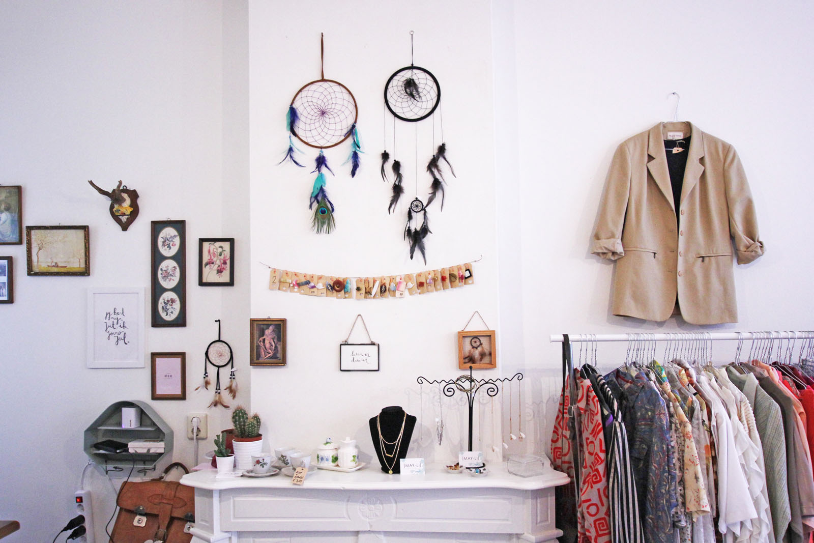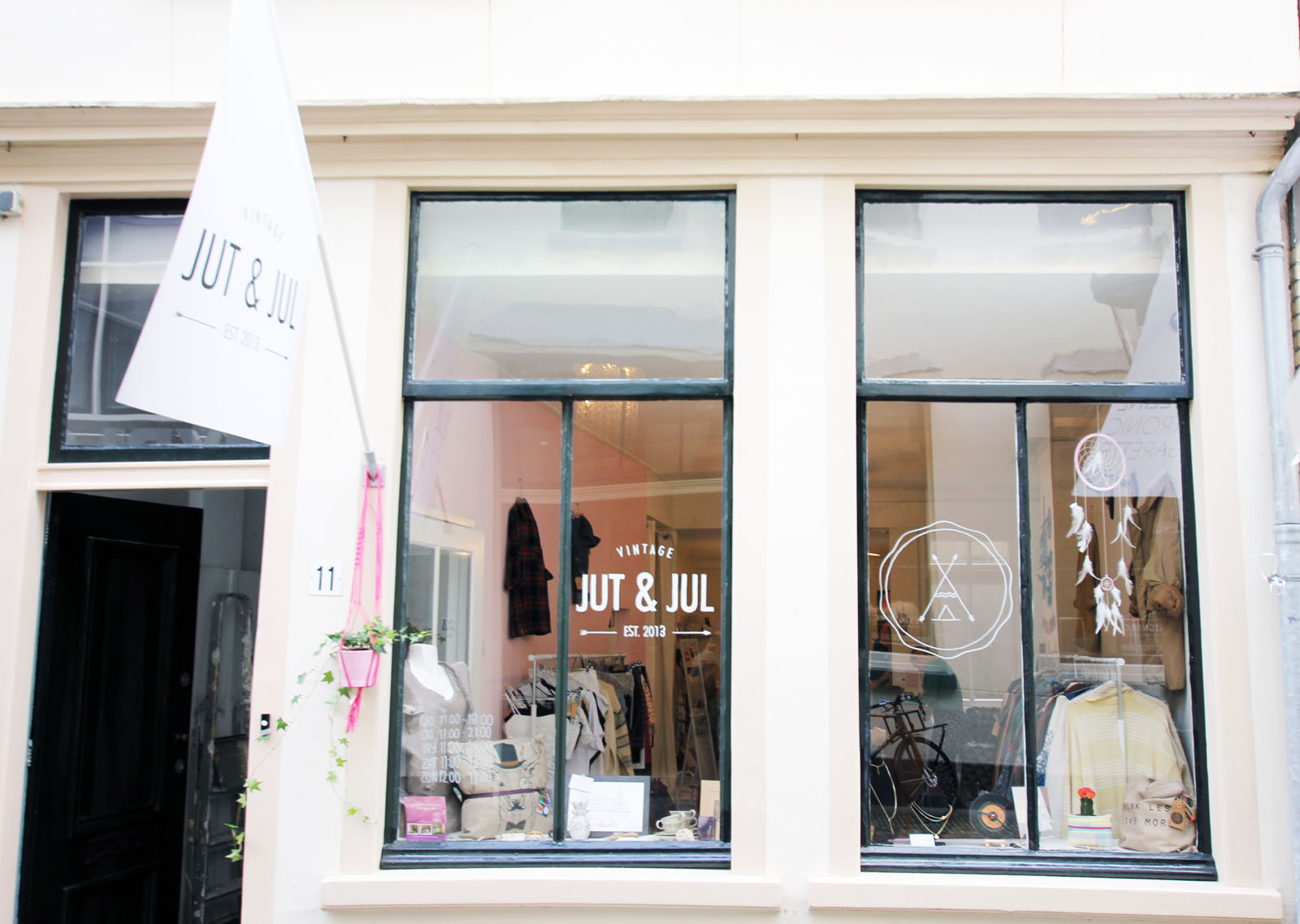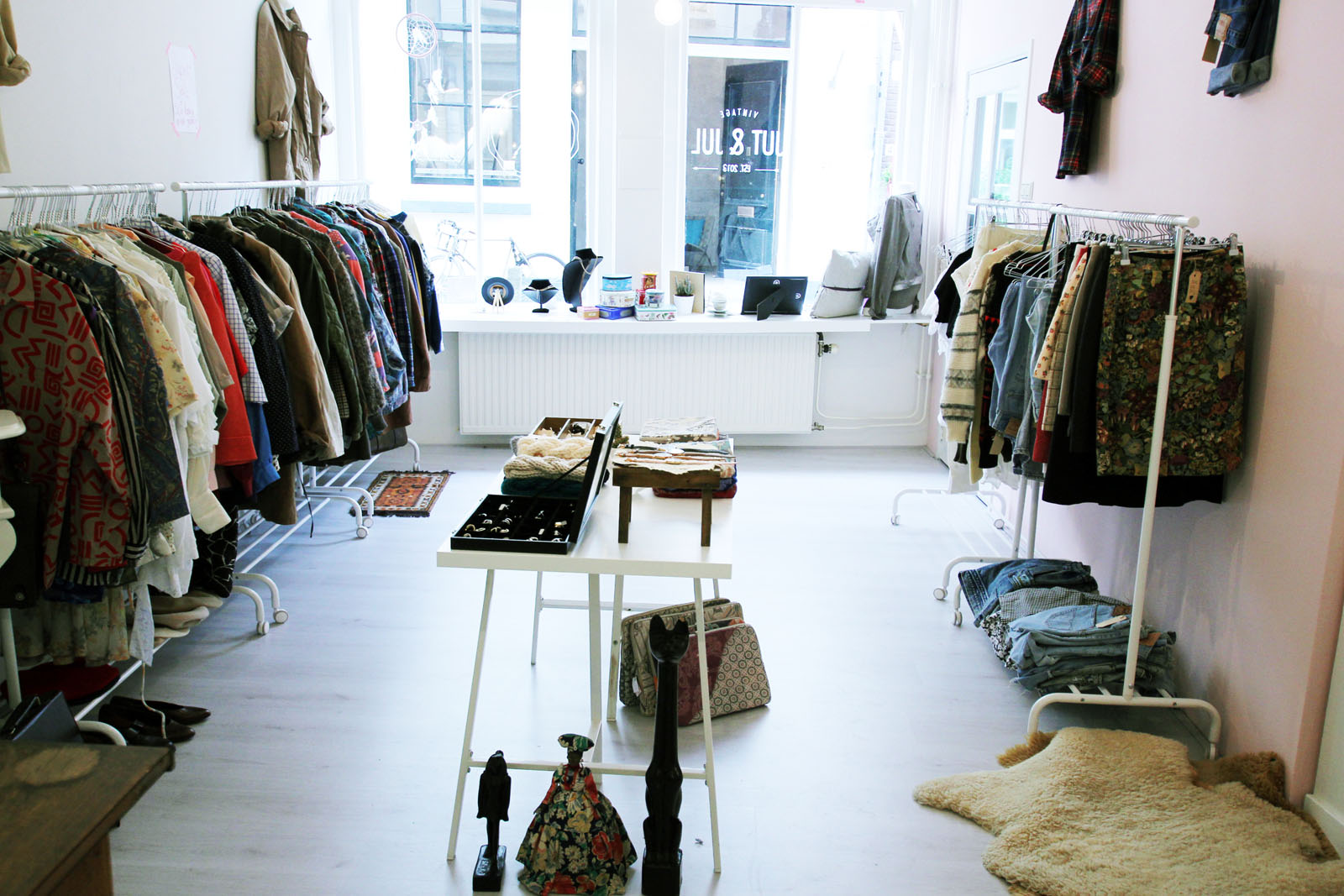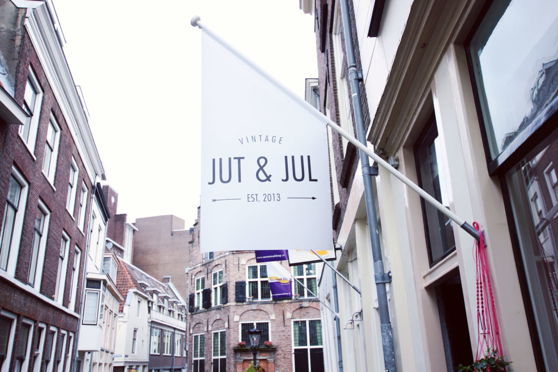 Jut en Jul heeft niet de ambitie om de zoveelste vintagewinkel in Utrecht te openen. Ze kozen er bewust voor om hun assortiment breder in te steken en een combinatie te maken tussen nieuw, vintage en handgemaakt. Achterin de winkel vind je mini pop-up stores waar ondernemers en ontwerpers een plankje of volledige stellingkast kunnen huren. Hier betalen zij een vast bedrag per maand voor (€50 excl. btw voor een plankje – €100 excl. btw voor een kast). De opbrengst van de producten die Jut en Jul verkopen, gaat volledig naar de ontwerpers. Zo kunnen beide partijen hun slaatje eruit slaan. Met dit concept springt Jut en Jul in het gat dat Spring Stores aan de Voorstraat helaas moest achterlaten. Veel van de ontwerpers die daar lagen, hebben hun weg in de schappen weer teruggevonden via Jut en Jul.