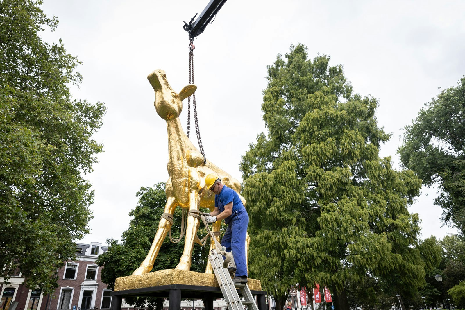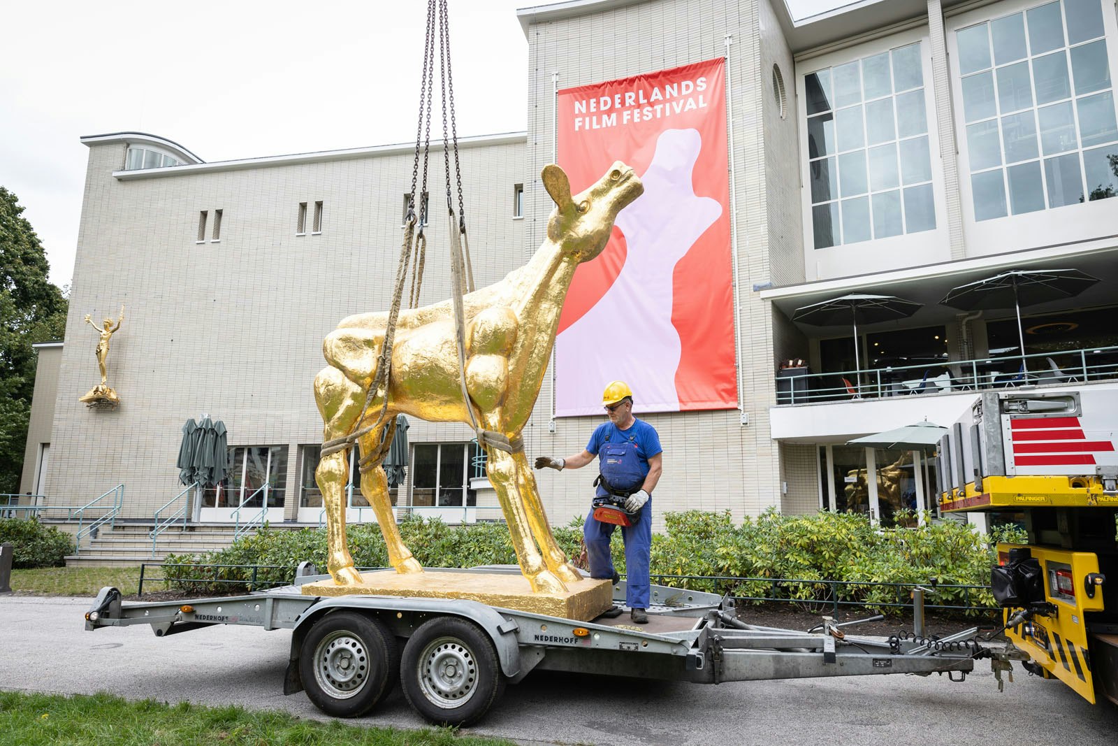 De grote variant van het Gouden Kalf is weer neergestreken op het grasveld voor de Stadsschouwburg in Utrecht. Het beeld werd woensdag op een aanhanger achter een vrachtwagen de stad ingereden en via een hijskraan op zijn sokkel gezet. Het kalf blijft staan tot het eind van het Nederlands Film Festival (NFF) dat vrijdag begint.