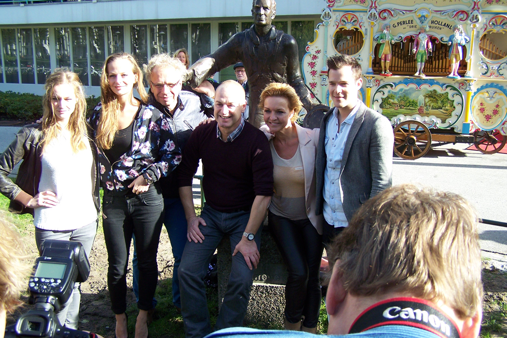 Het beeldje ‘Nikkelen Nelis’ is vandaag voor de hoofdingang van Stadsschouwburg Utrecht geplaatst ter gelegenheid van de musical ‘Sonneveld’ die op zondag 27 oktober hier in première gaat. Wethouder Lintmeijer heeft het beeld samen met de cast onthuld.