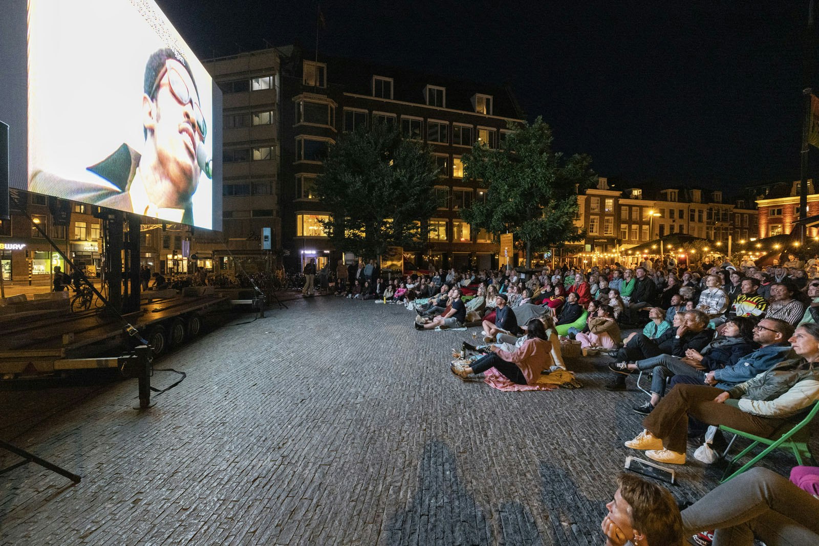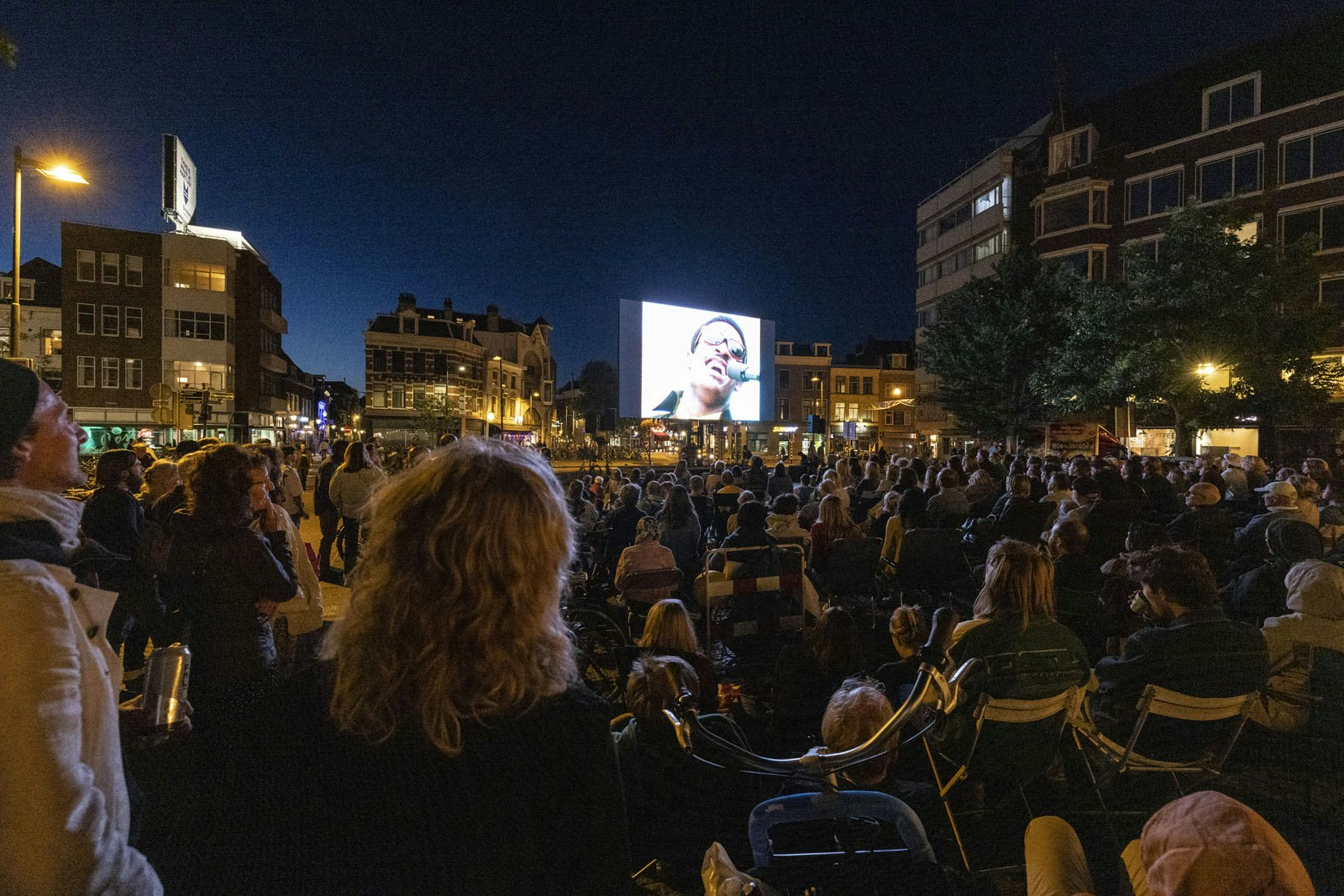 Honderden Utrechters waren vrijdagavond samengekomen op de Neude om naar de muzikale documentaire Summer of Soul te kijken. Het was een initiatief van Jos Stelling, waarmee hij de officiële opening van zijn Slachtstraat Filmtheater vierde.