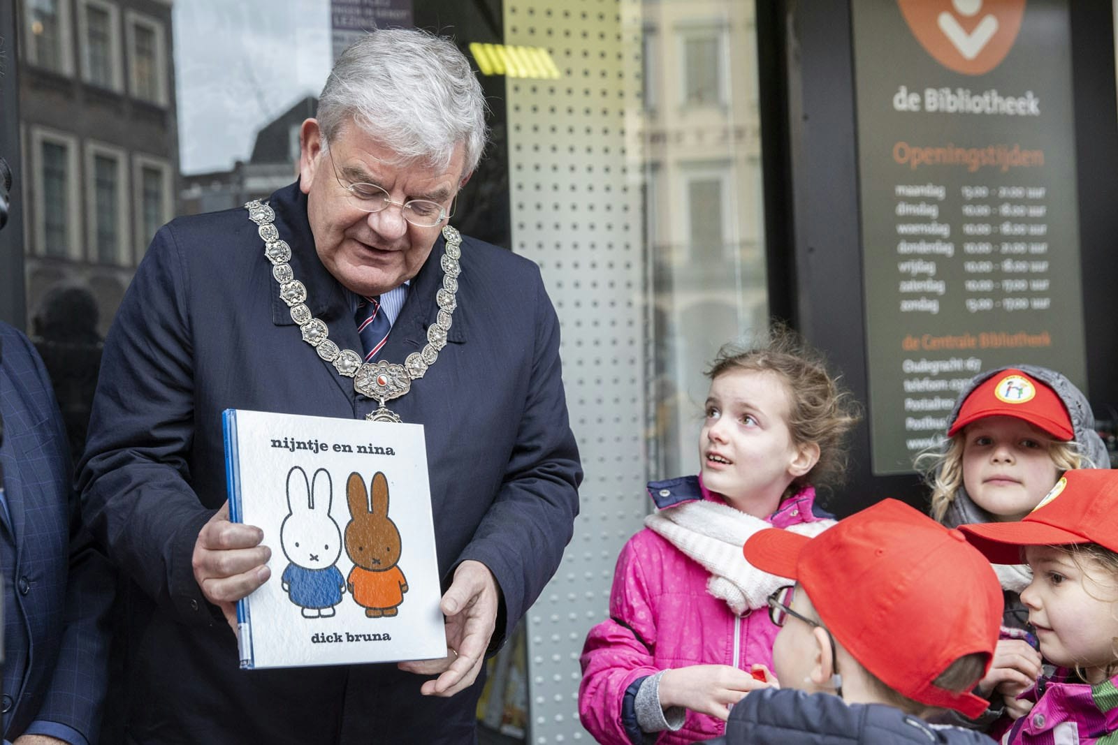 Burgemeester Jan van Zanen gaf na een korte toespraak waarin hij het belang van lezen benadrukte het startschot voor De grote Utrechtse boekverhuizing. Dit deed hij door ‘nijntje en nina’, het eerste kinderboek dat naar de nieuwe locatie van bibliotheek wordt gebracht, door te geven. Na het boek van Dick Bruna volgden nog vele kinderboeken die vanwege de regen waren ingepakt.