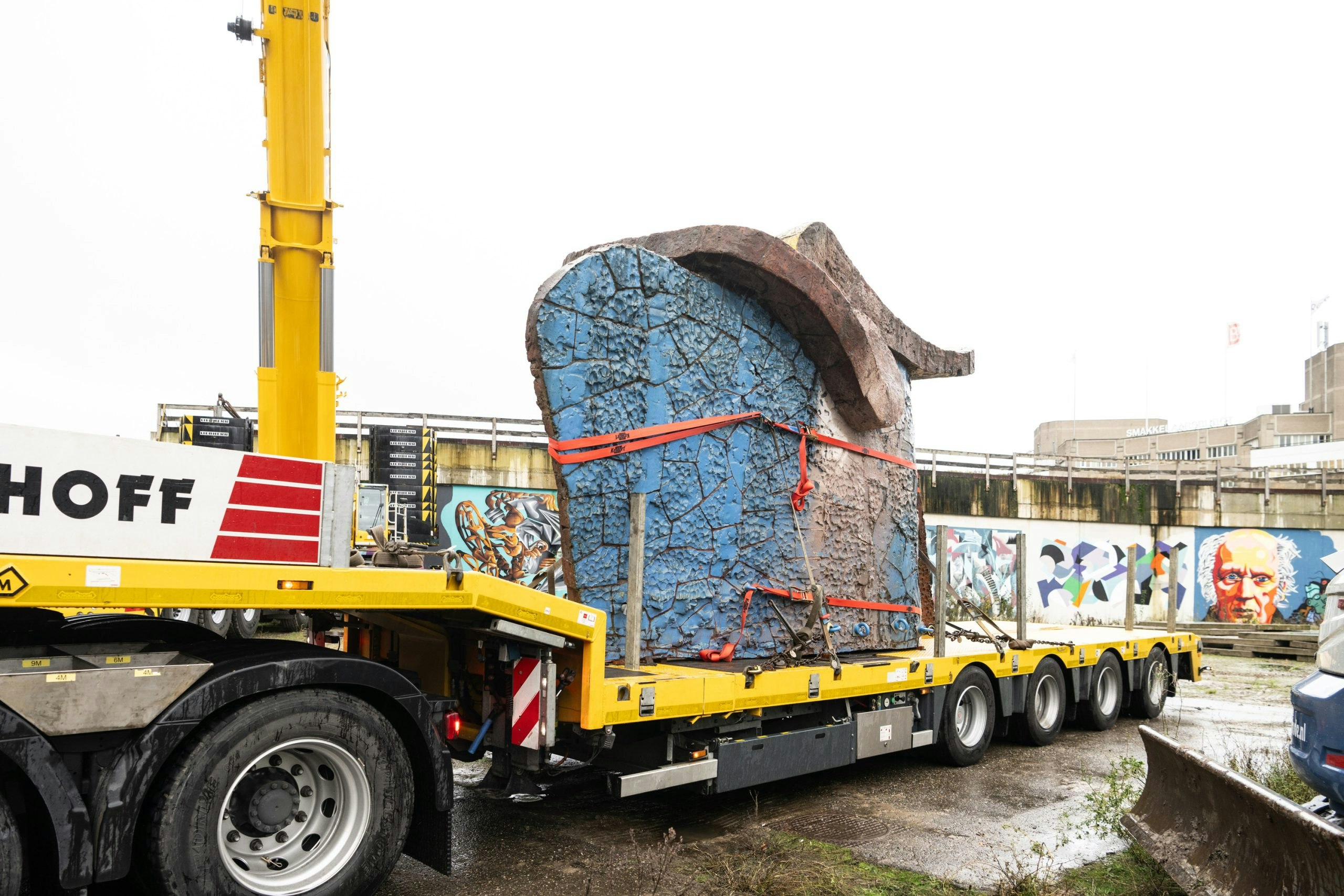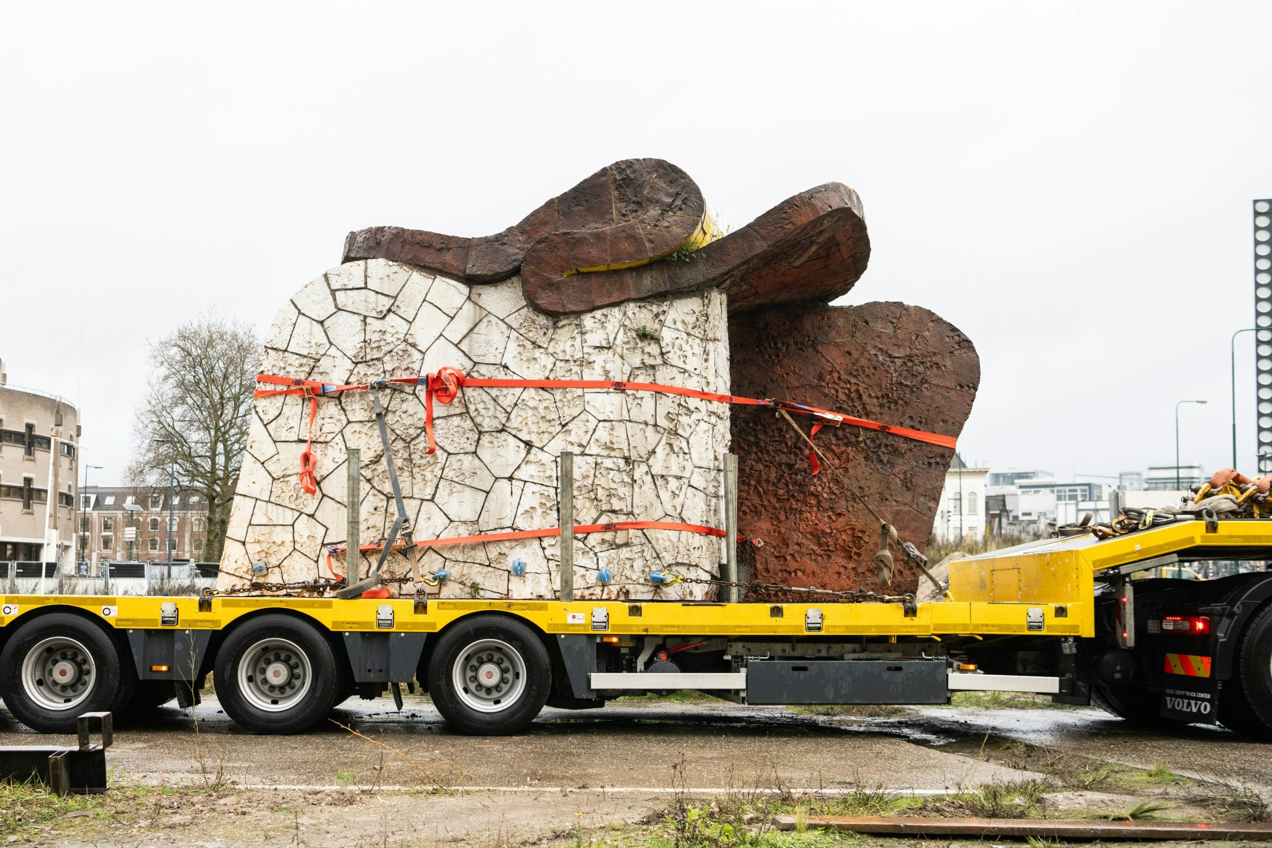Het kolossale kunstwerk is vrijdag op een dieplader gehesen en afgevoerd naar de opslag in Papendorp. Daar kan het twee jaar blijven en in de tussentijd wordt verder gezocht naar een geschikte plek voor het kunstwerk – in of buiten Utrecht.