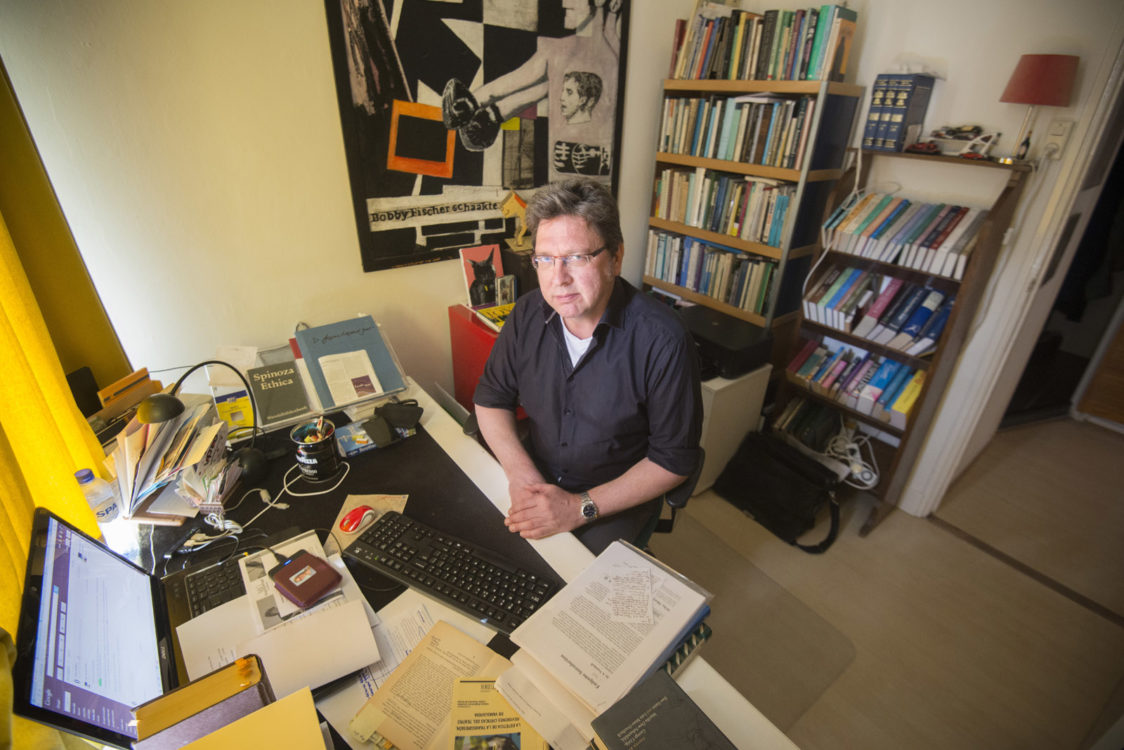 “Ik kom graag op het Smaragdplein.” Kosters schenkt een kop filterkoffie voor me in. We zitten in zijn woonkamer. Zijn oude zwarte kat doet een dutje in de zon voor het raam. “Daar zit een fijne markt. Het is een van mijn guilty pleasures. Soms moet ik een heel blok lang op dinsdagochtend college geven en ben ik erg teleurgesteld. Dan kan ik m’n kaas niet kopen.” Ook Orloff, De Rechtbank en het gebied rondom het Ledig Erf, het Louis Hartlooper Complex en Orloff aan de kade zijn favoriet.