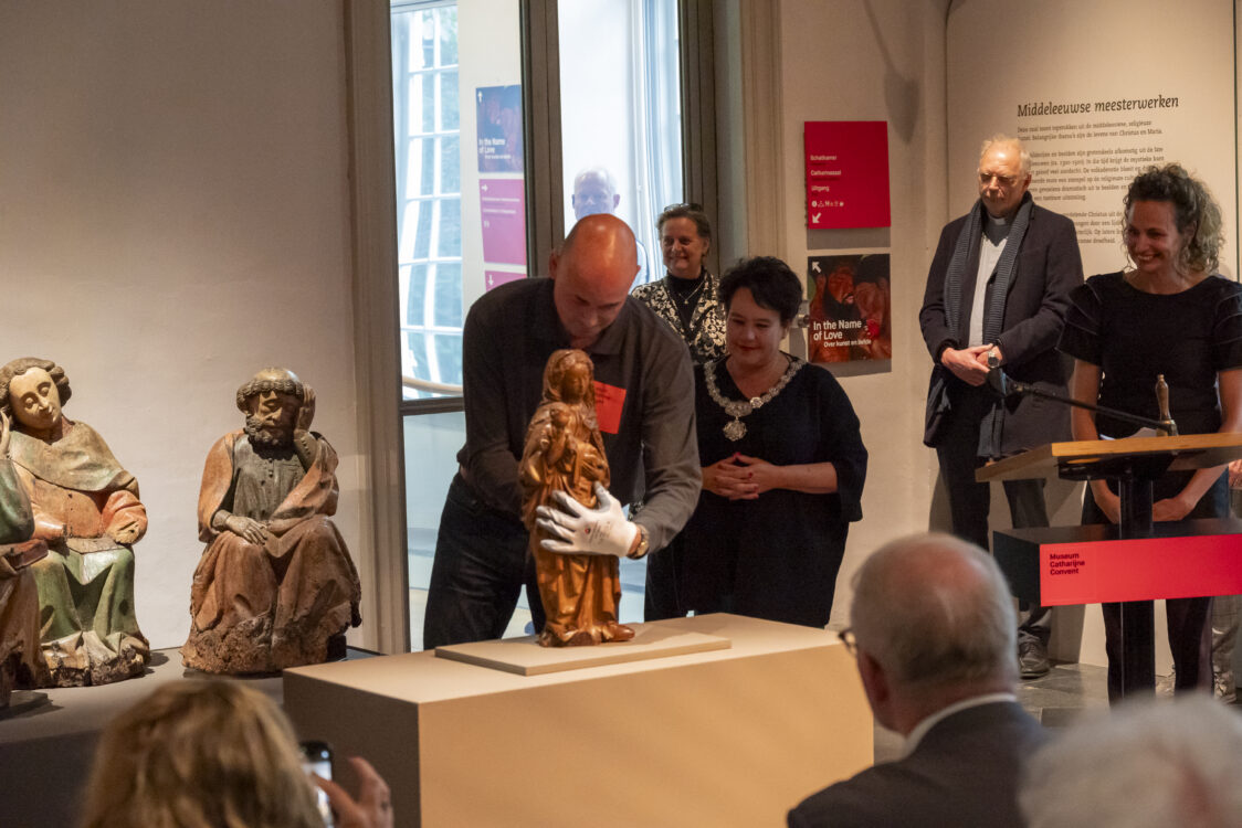 Maria en kind is vanmiddag, na een welkomstwoord van de directeur van het museum, onthuld door burgemeester Sharon Dijksma. Na de feestelijke onthulling gaf René de Kam, conservator middeleeuwen, een toelichting bij het nieuwe collectiestuk.