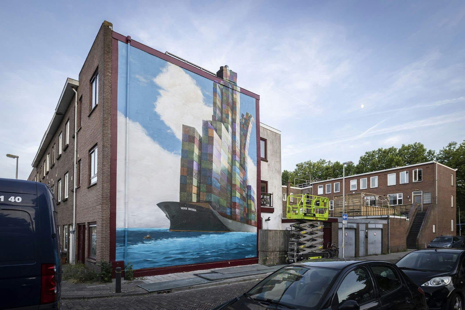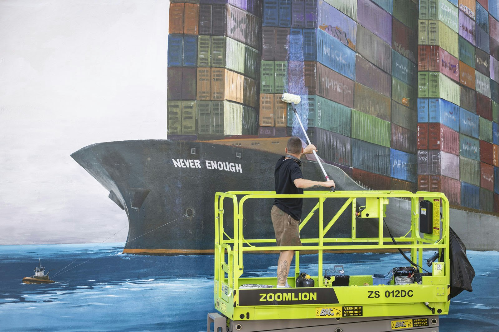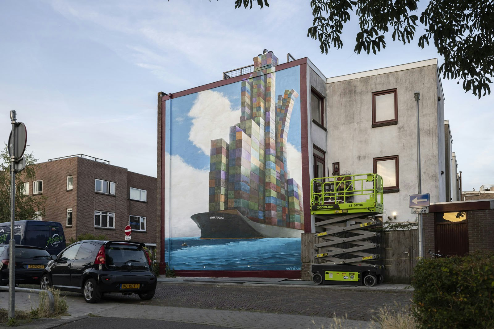 Het nieuwe werk laat een overvol vrachtschip zien en het is te vinden op de hoek van de Bonistraat en de Menadostraat, vlakbij de Spinozabrug. “We hoeven tegenwoordig maar twee keer te klikken om iets te bestellen. Veel mensen staan er denk ik niet bij stil dat al die producten geproduceerd moeten worden en vervolgens via vervuilende vrachtschepen duizenden kilometers afleggen. Het gaat dan vaak ook nog om goedkope spulletjes die de volgende dag weer worden weggegooid.”