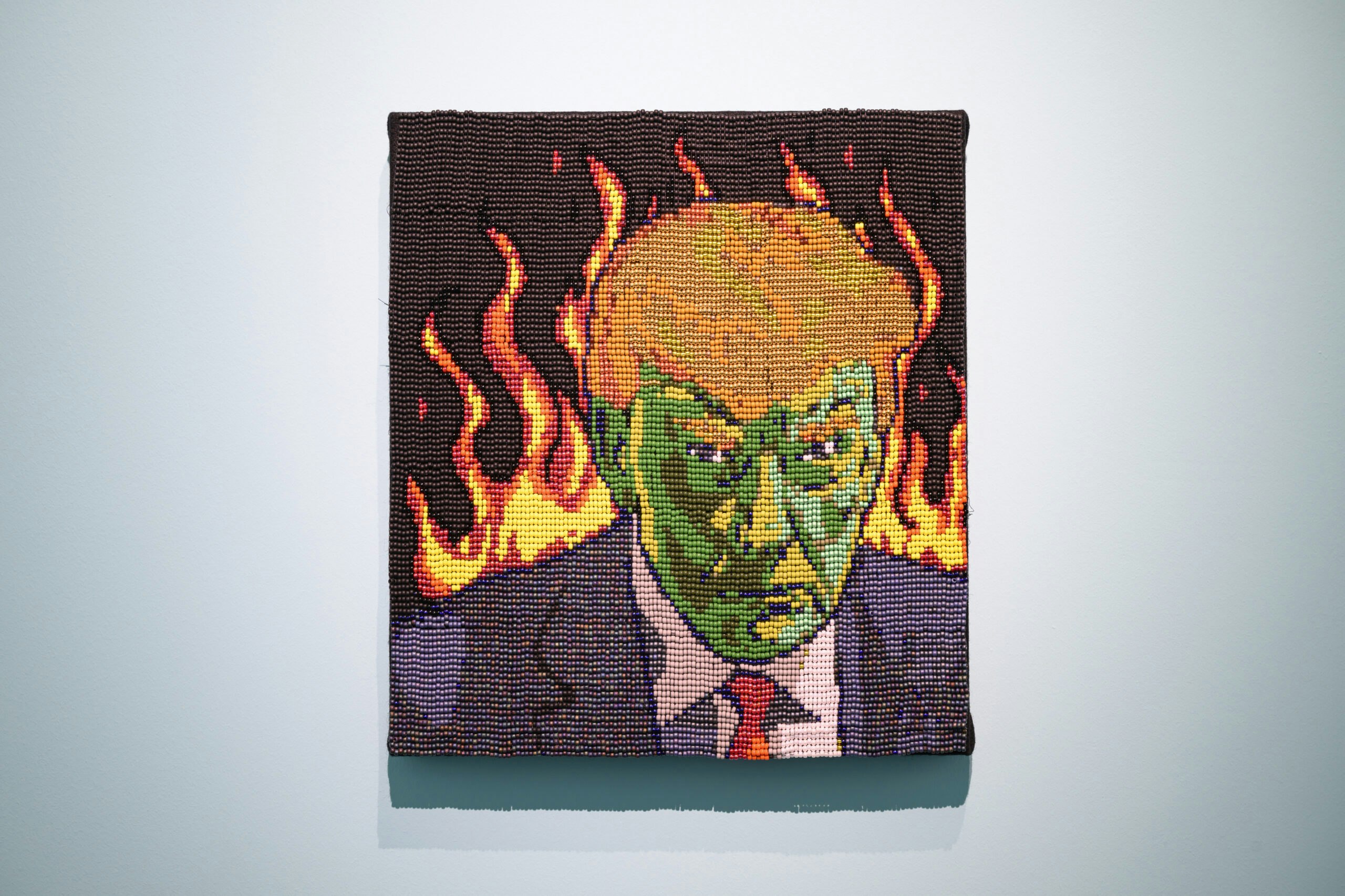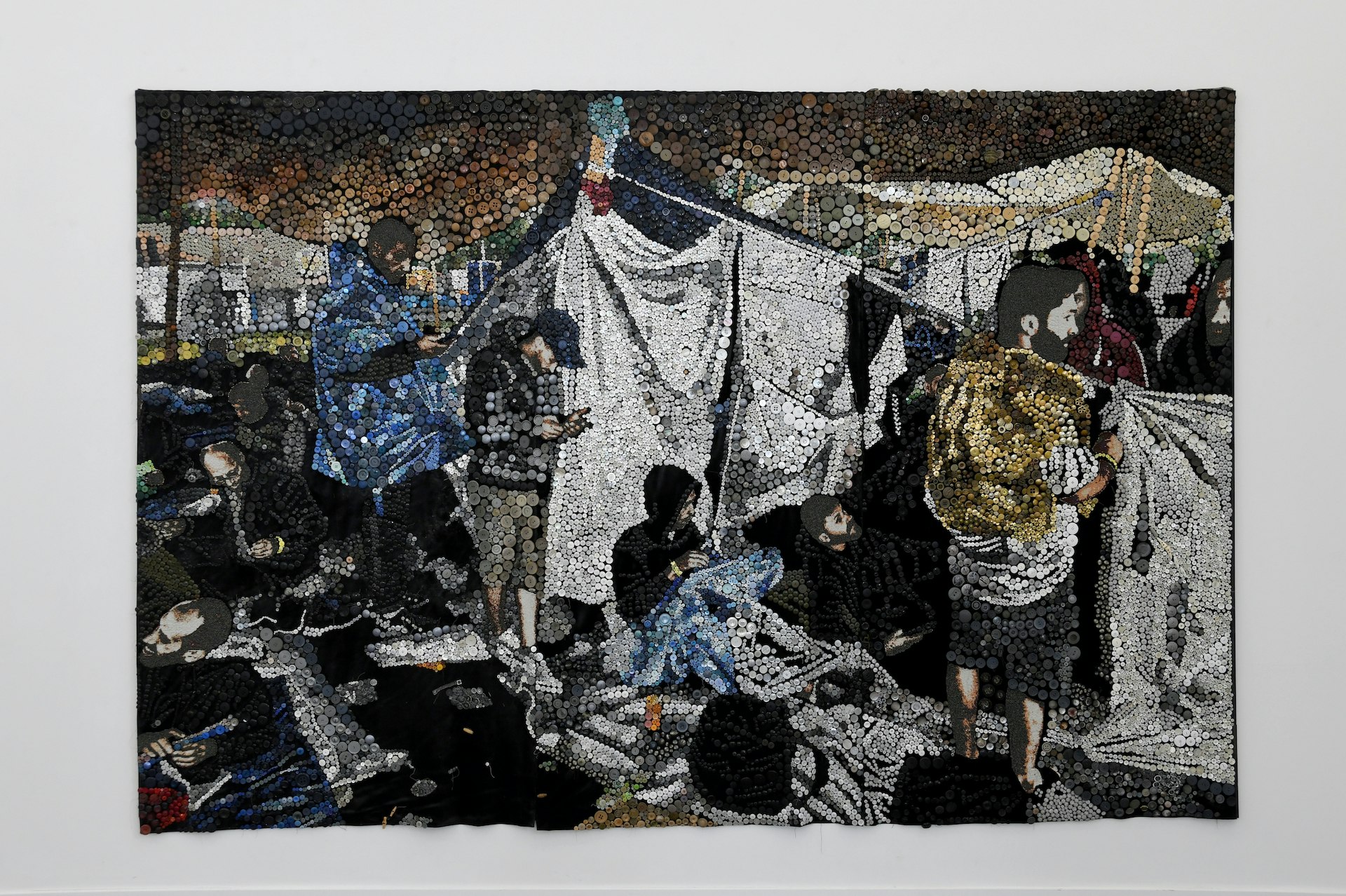 Veel van die werken maakt ze op basis van foto’s. Zo hangt er onder meer een wandkleed dat is gebaseerd op een nieuwsfoto van het vluchtelingenkamp in Ter Apel. “Het werk is gemaakt met tienduizenden met de hand geborduurde knopen, gebruikt en gedoneerd door meer dan 130 mensen”, schrijft het Centraal Museum.