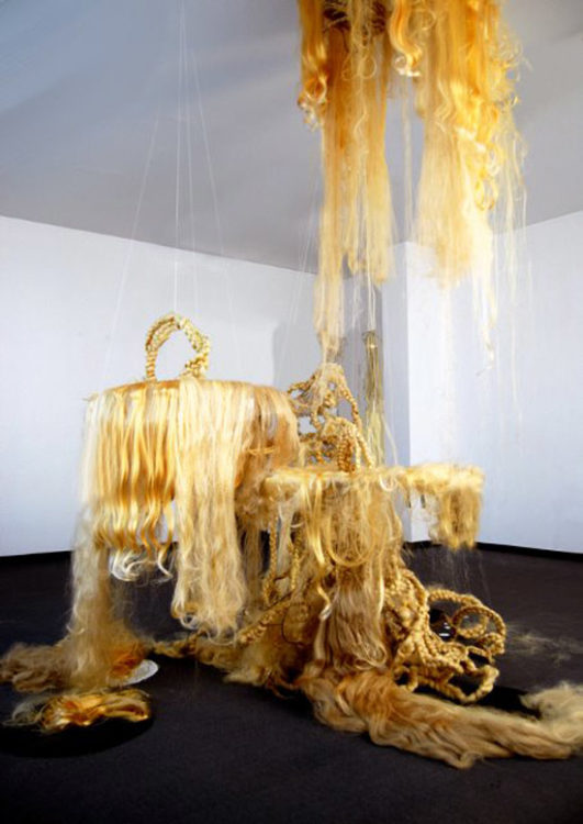 Tijdens ‘Ontmoet Oost” was onder andere de installatie ‘Olalalorelei’ van Elaine Vis te zien: lange goudblonde vlechten woekeren sierlijk de ruimte in, maar er zijn ook klitten die de bewonderaar verstrikken.