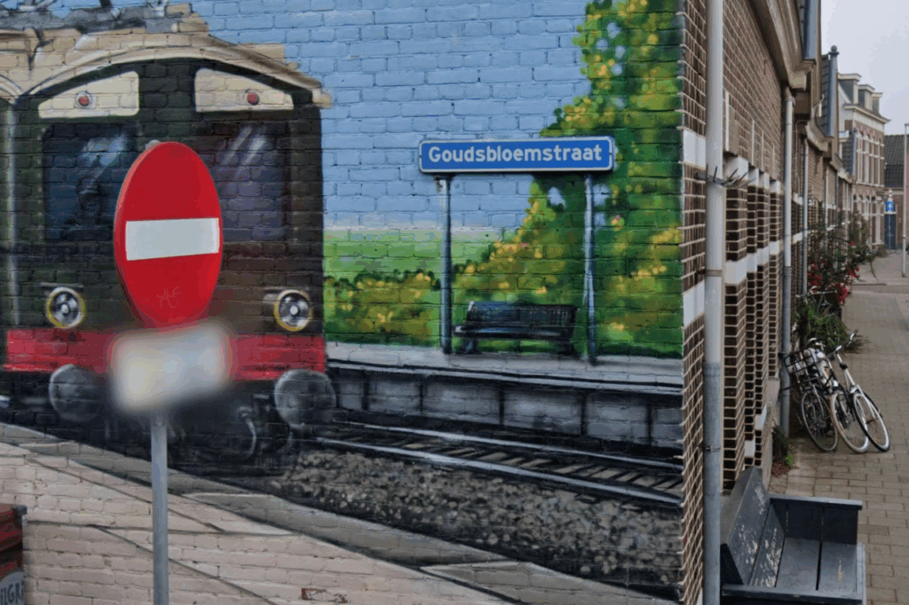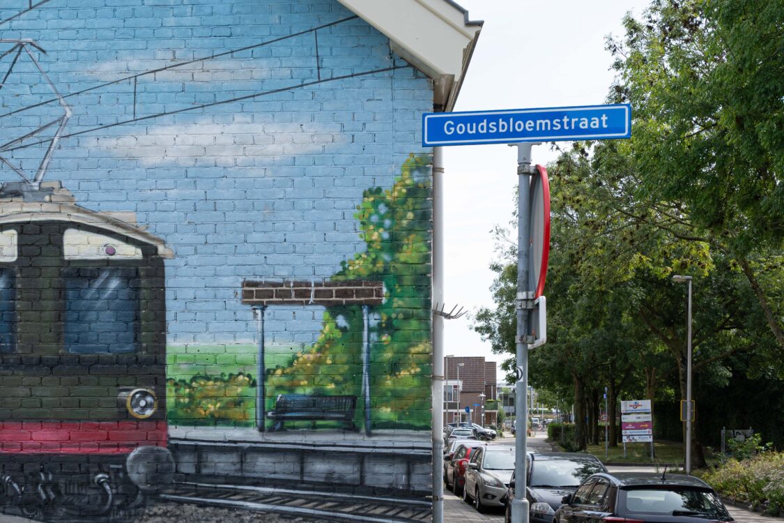 Een tijdje geleden zijn in de hele buurt de straatnaamborden vervangen. Zo ook in de Goudsbloemstraat. Het oude straatnaambord is van de muur gehaald, en een nieuwe is teruggeplaatst op een paal naast de muur. Als gevolg is er een gat in de muurschildering ontstaan, en is de creatieve oplossing van de Verfdokter verloren gegaan.