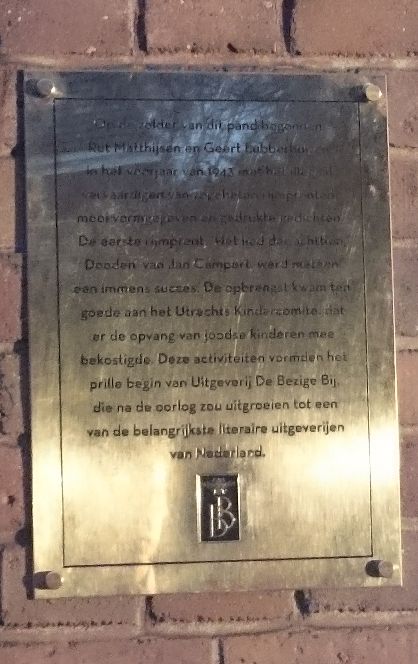 Op de zolder van de Van Limburg Stirumstraat 19 ontstond in het voorjaar van 1943 De Bezige Bij. Tijdens de oorlog begonnen Lubberhuizen en Matthijsen met het illegaal vervaardigen van rijmprenten. Lubberhuizen woonde als student op de zolder van deze woning en hield zich er met allerlei illegale activiteiten bezig. De eerste rijmprent, ‘Het lied der achttien Dooden’ van Jan Campert, werd meteen een groot succes. (Zijn zoon Remco was helaas verhinderd gisteren.) De opbrengst van De Bezige Bij kwam ten goede aan het Utrechts Kindercomité, dat er de opvang van joodse kinderen mee bekostigde.