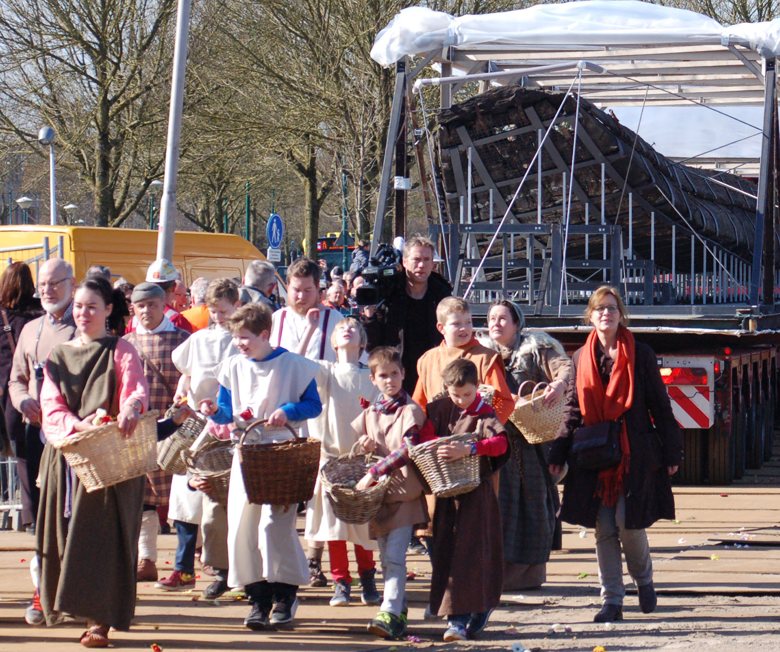 Vandaag is het Romeinse schip ‘De Meern 1’ teruggekeerd naar Leidsche Rijn en op het paviljoen van Castellum Hoge Woerd geplaatst. Veel mensen kwamen op de intocht van het 25 meter lange schip af. Wethouder Kees Geldof heeft een handje meegeholpen om het stuk erfgoed de gemeente Utrecht binnen te takelen.