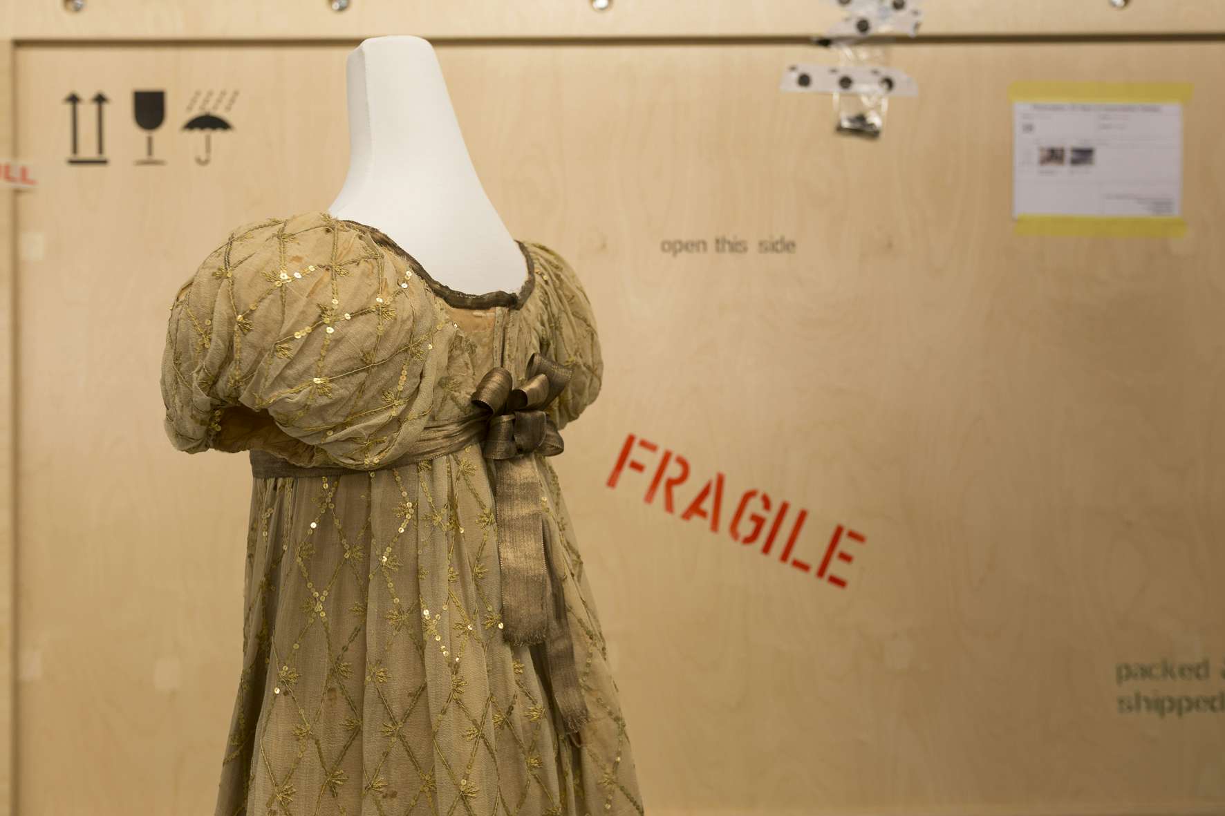 Directeur Bart Rutten is ongelofelijk trots op het resultaat. “De collectie bestaat uit heel veel kwetsbare materialen. Daarom kunnen de kledingstukken alleen tijdelijk worden tentoongesteld. We vinden het interessant om de spanning tussen mode uit het verleden en het heden neer te zetten.” Die kwetsbaarheid van de materialen is goed terug te zien. Zo liggen kledingstukken die te broos zijn om aan een pop gehangen te worden in twee ‘doodskisten’.
