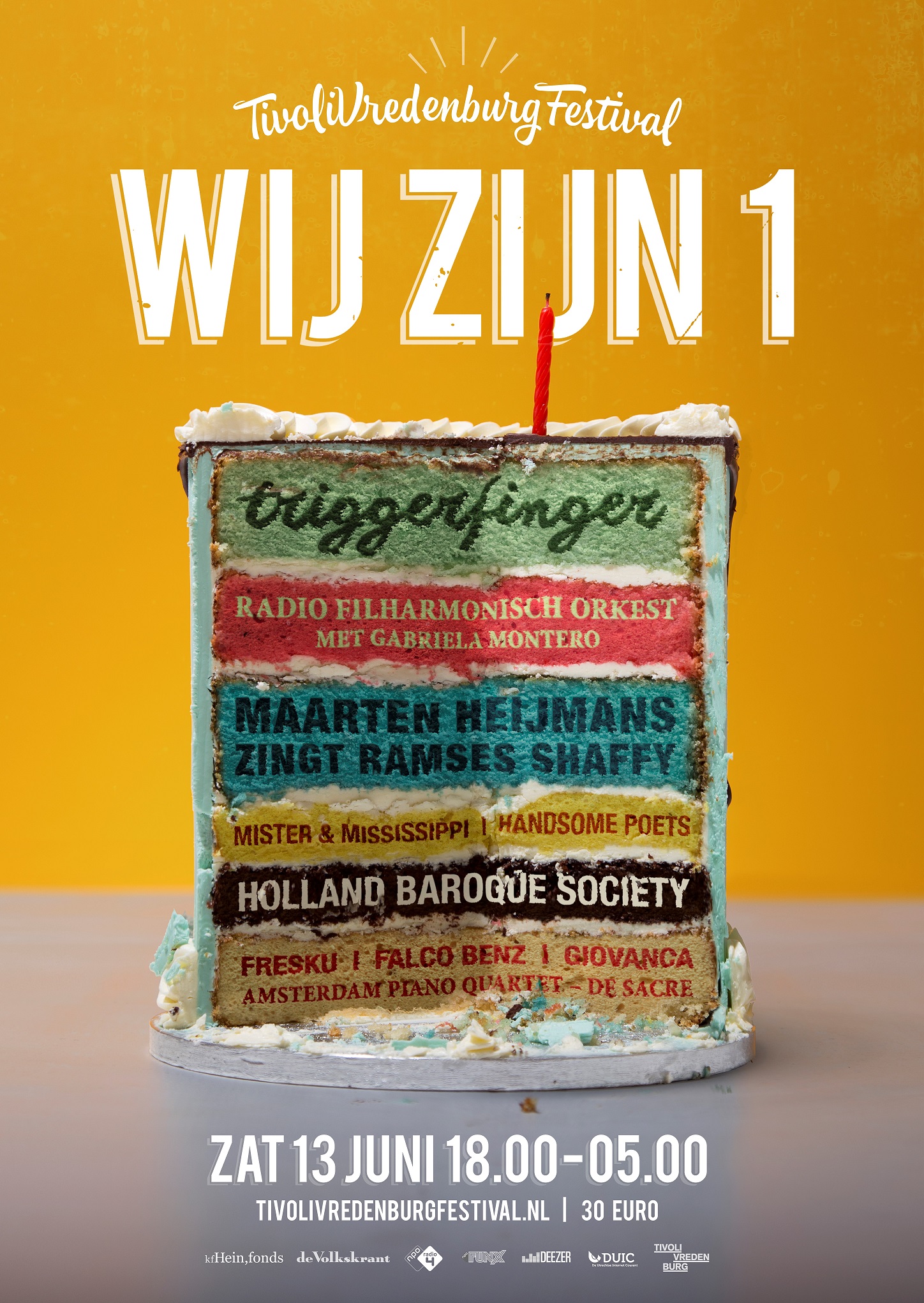 Het Belgische rocktrio Triggerfinger, het Radio Filharmonisch Orkest met Gabriela Montero en Maarten Heijmans zingt Ramses Shaffy, zijn enkele van 30 acts die op het festival zullen optreden. Triggerfinger is deze zomer een graag-geziene gast op de grote Europese festivals en zal in de Ronda spelen. Het Radio Filharmonisch Orkest was vorig jaar een van de hoogtepunten van het openingsfestival van TivoliVredenburg en neemt dit keer pianiste Gabriela Montero mee naar de Grote Zaal. Maarten Heijmans was afgelopen maart nog te zien in TivoliVredenburg. Het concert werd door publiek en pers lovend ontvangen en is daarom speciaal voor het verjaardagsfeestje van TivoliVredenburg nogmaals te zien.