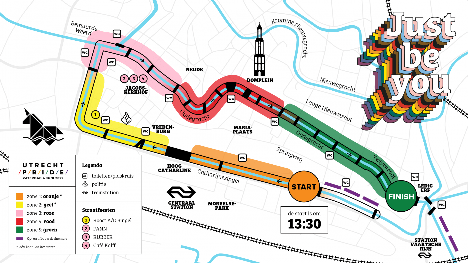 Om 13.30 uur gaan de trossen los, op dat moment vertrekken de vijftig deelnemende boten een voor een vanaf de Catharijnesingel, ongeveer ter hoogte van de Martinusbrug. De gekleurde stoet vertrekt vanaf daar richting Hoog Catharijne om bij de Bemuurde Weerd de Oudegracht op te draaien. De parade eindigt bij het Ledig Erf. De laatste boot komt hier ongeveer om 18.00 uur aan.