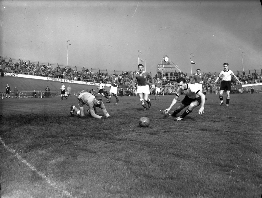 In de 20e eeuw waren er verschillende beroemde fotografen actief in Utrecht. Maar niemand bracht Utrecht zo goed in beeld als de fotograaf F.F. van der Werf. Het Utrechts Archief opende vorige week een tentoonstelling over Van der Werf, DUIC bespreekt wekelijks een van zijn meest opzienbarende foto’s. Vandaag: een van de voorlopers van FC Utrecht in actie tegen de Groningers in 1957.