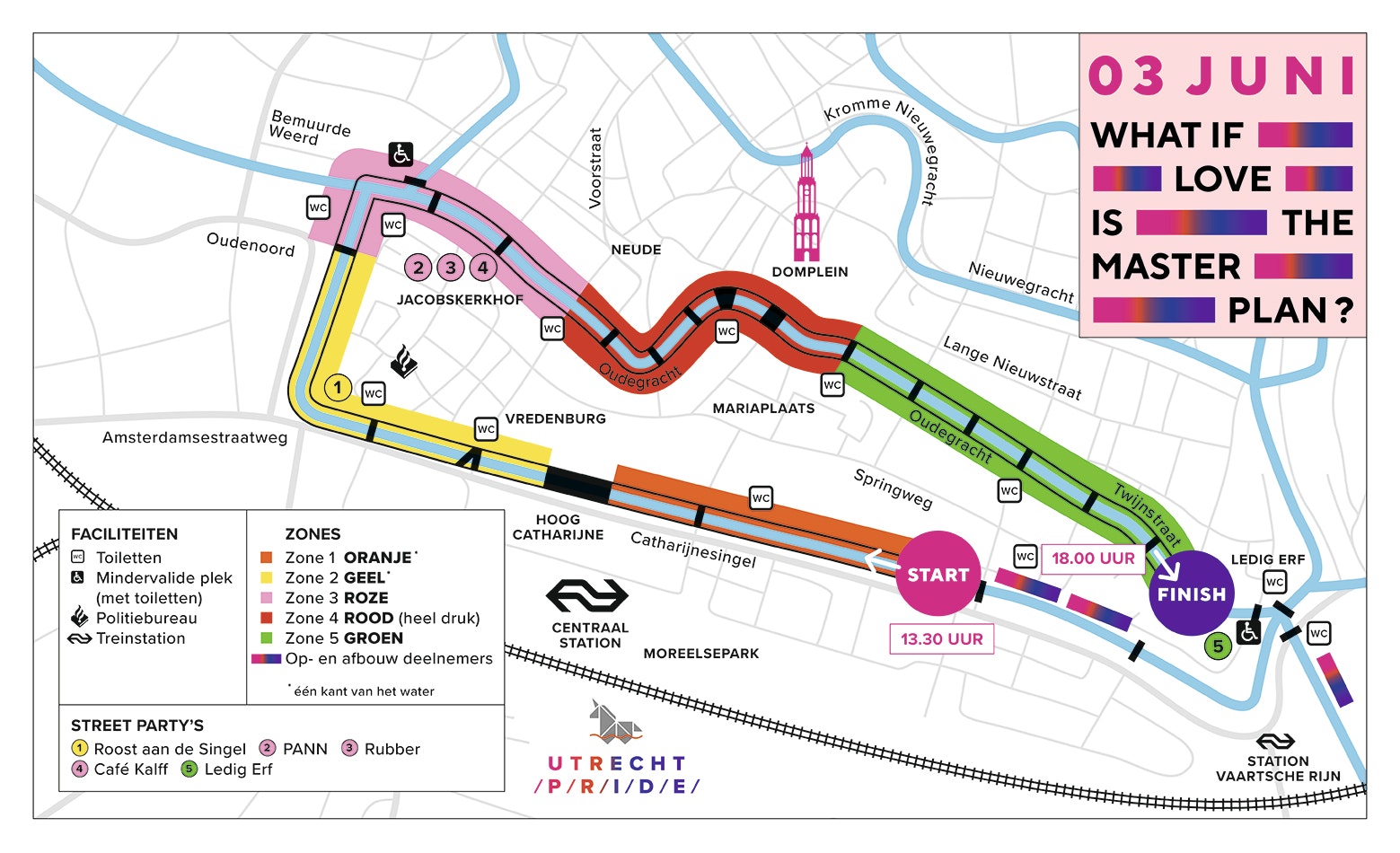 De roze zone wordt het hart van de Utrecht Pride genoemd en bevindt zich rond de Bodytalk en Café Kalff. “We verwachten hier grote drukte”, aldus de organisatie. De rode zone ligt iets verderop en ook hier is ‘beperkt zicht’ vanaf de straat vanwege onder meer het winkelend publiek. Langs de groene zone, die vanaf de Gaardbrug tot het Ledig Erf loopt, is straks weer volop ruimte om de parade te bekijken.