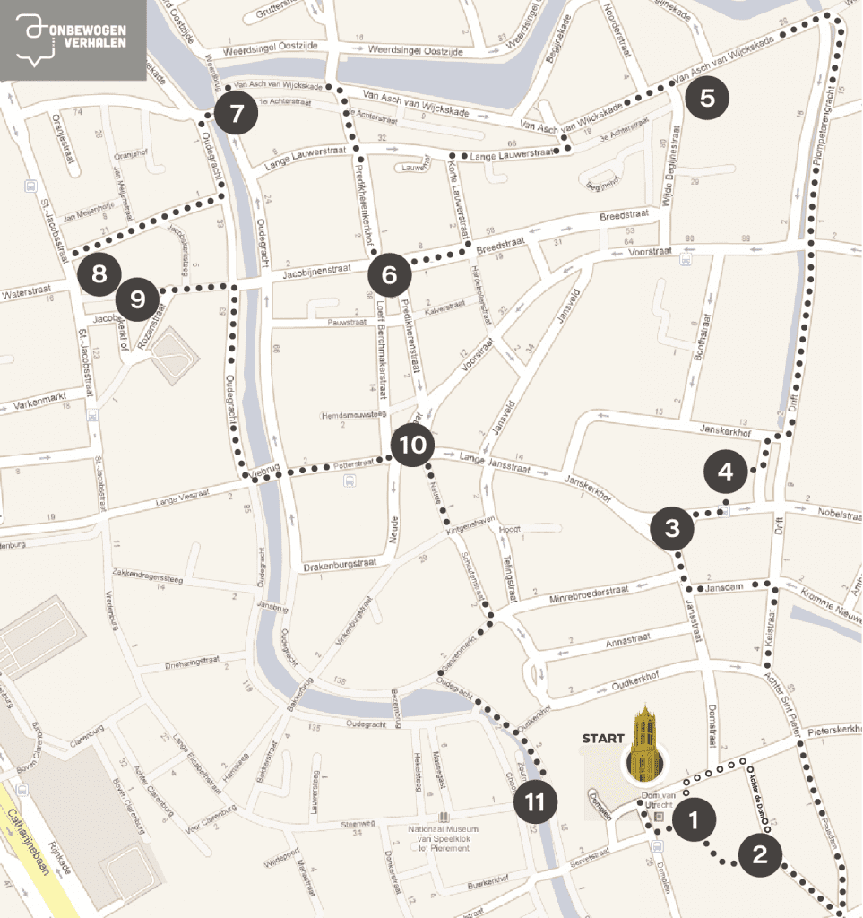 De route van Onbewogen Verhalen loopt door het centrum van Utrecht. Op de routekaart staan elf beelden waar een verhaal bij is geschreven. Mensen die de route willen lopen, kunnen de routekaart downloaden en als ze bij een standbeeld zijn aangekomen, via de website het bijbehorende audiofragment luisteren. De verhalen duren gemiddeld vier minuten.