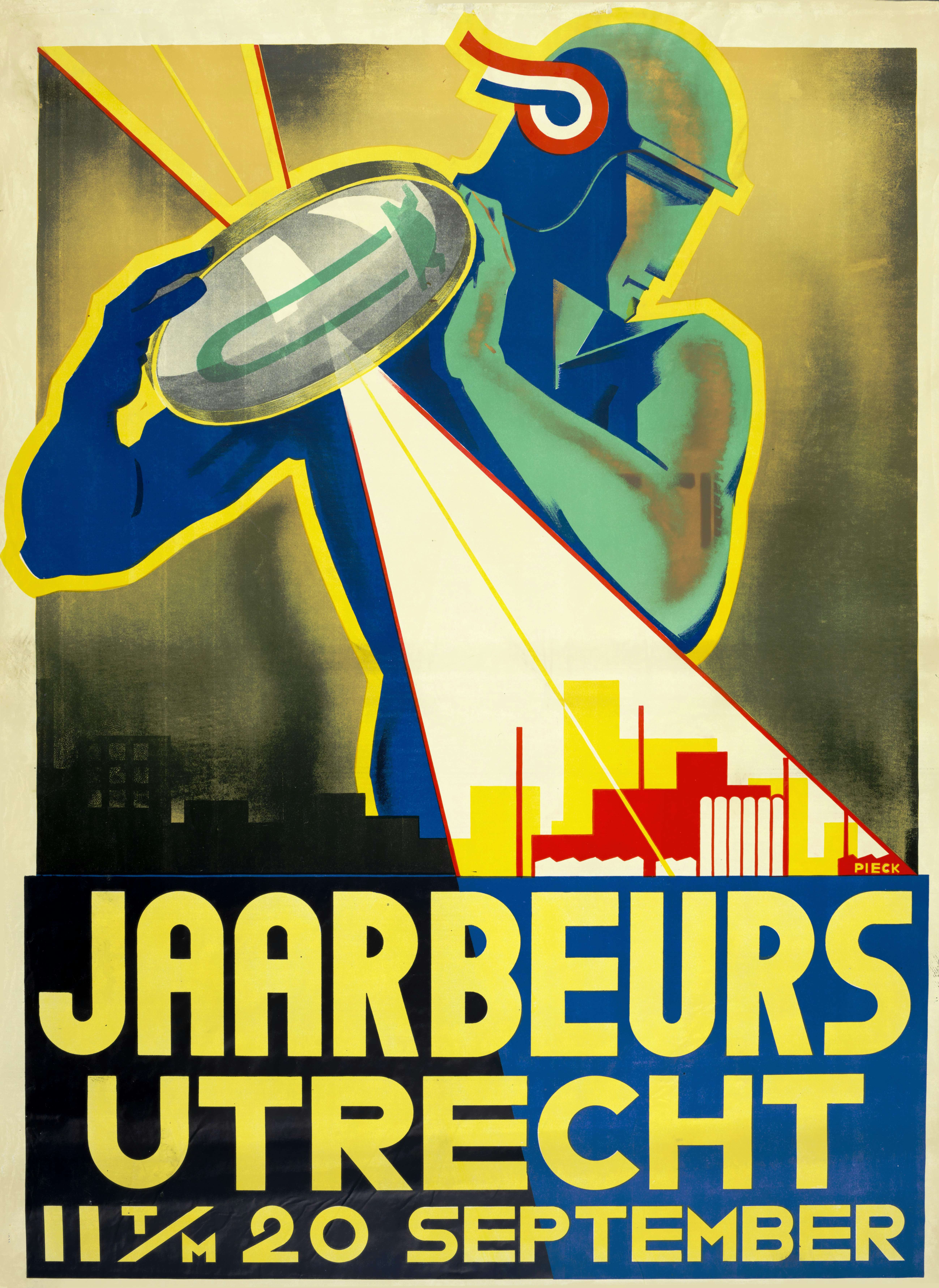 Vanaf 5 september toont Het Utrechts Archief deel twee van de tentoonstelling De mooiste affiches van de Jaarbeurs. Een in het oog springend affiche uit de nieuwe selectie is in 1934 gemaakt door Henri Pieck (1895-1972), de tweelingbroer van Anton. Eerder ontwierp hij al het Jaarbeurs-logo – nog altijd in gebruik – dat ook op subtiele wijze op het affiche is afgebeeld.