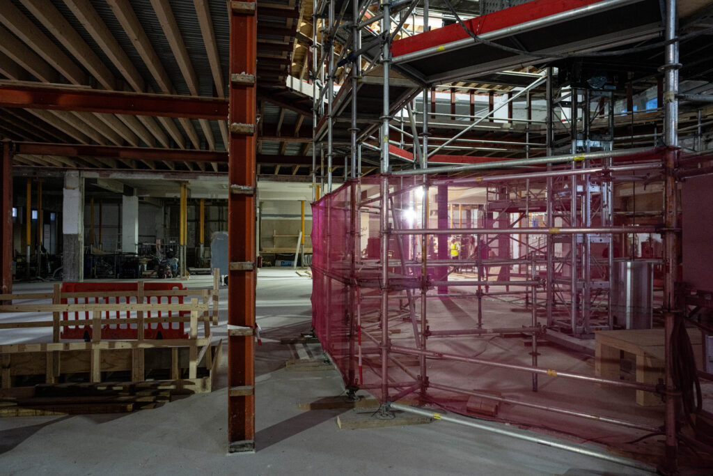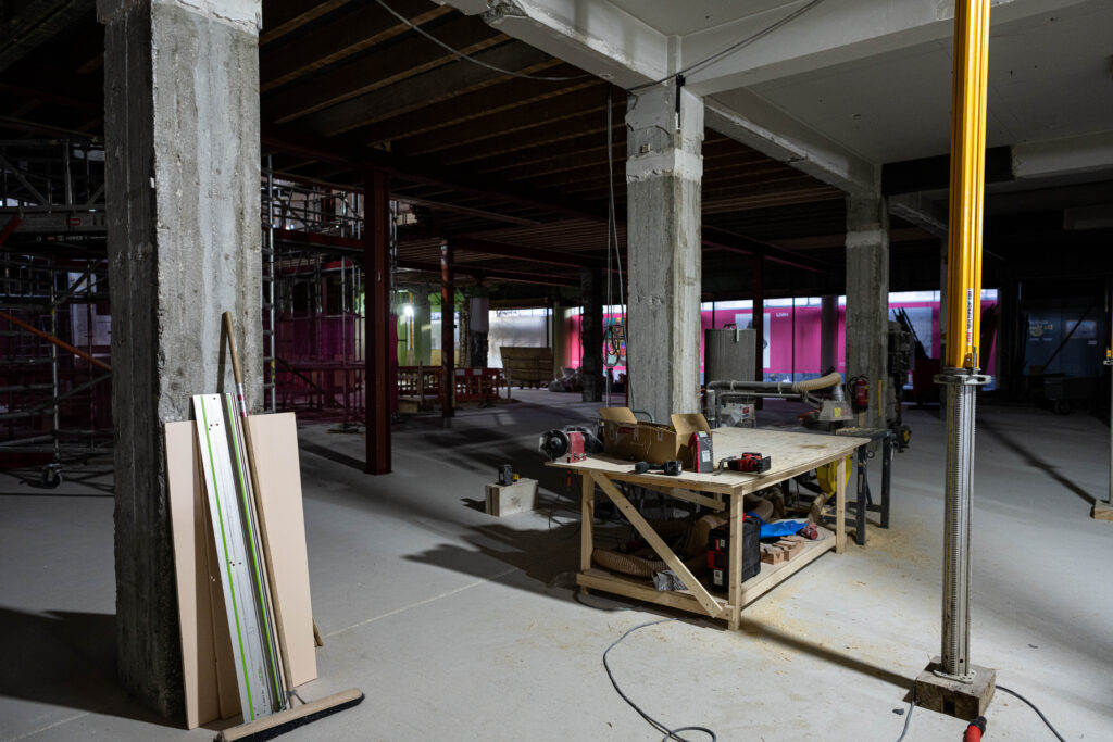 Over de grond van de hele verdieping ligt nog een kaal raster van betonijzer. De journalisten, wethouders, kinderen en andere gasten lopen er wat onwennig over heen, als met blote voeten op een kiezelstrand, maar dan op geleende veiligheidsschoenen. De bouwvakkers gaat het beter af. Als het beton uit de slang vloeit, bewegen ze moeiteloos om de wethouder en directeur heen, om alles in goede banen te leiden.