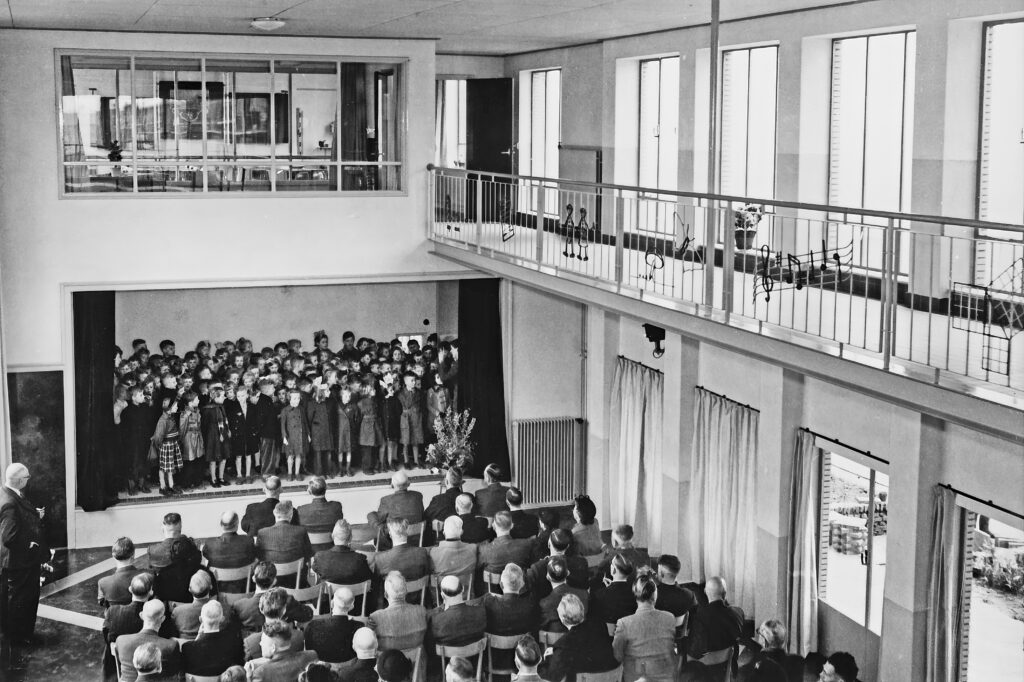 Het krantenverslag vervolgde: ‘Burgemeester O. Norbruis droeg de school over aan de Schoolvereniging. Hij verheugde er zich over iets nieuws, wat de inrichting betreft, te mogen overdragen.’ Daarna kwamen sprekers aan het woord die ‘het ontwerp van de heer W.C. van Hoorn ten zeerste prezen’. De bouw van de school was namelijk de verantwoordelijkheid van de toenmalige gemeente Zuilen en het ontwerp was van gemeentearchitect Wim van Hoorn (1911-1988). Hij kwam met een gebouw dat landelijk de aandacht trok: een halschool.