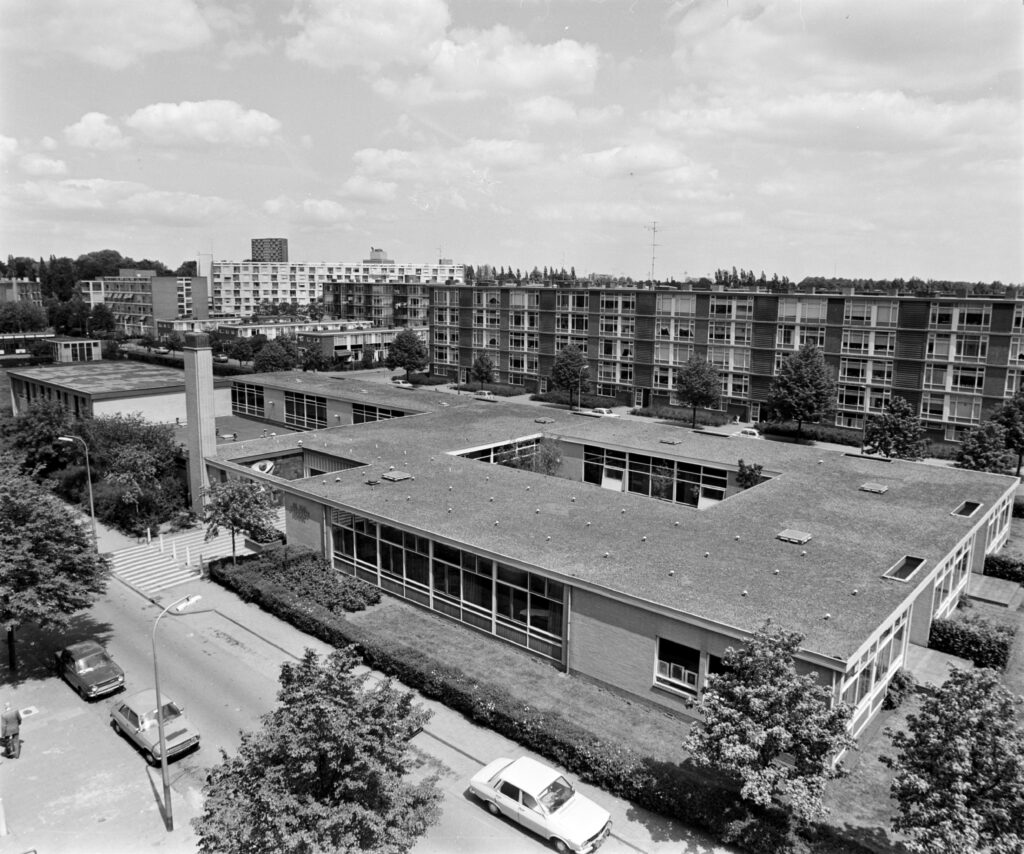 Het elegante schoolgebouw, gelegen naast een Rietveld-flat, beschikte over twee binnenplaatsen (patio’s), was opgetrokken uit lichte baksteen en voorzien van veel glas. Behalve door het kunstwerk werd de ingang ook gemarkeerd door een bakstenen schoorsteen annex toren. Een hellingbaan leidde naar de fietsenkelder. Het gebouw was een ontwerp van gemeente-architect Henk Dam (1921-2022). Hij had in Delft bouwkunde gestudeerd en werkte van 1950 tot 1982 bij de dienst Openbare Werken van de gemeente Utrecht. Dam ontwierp verschillende schoolgebouwen, zoals de MTS aan de Oudenoord, en bijvoorbeeld de stadsbussenremise aan de Europalaan en het verpleeghuis Albert van Koningsbruggen.