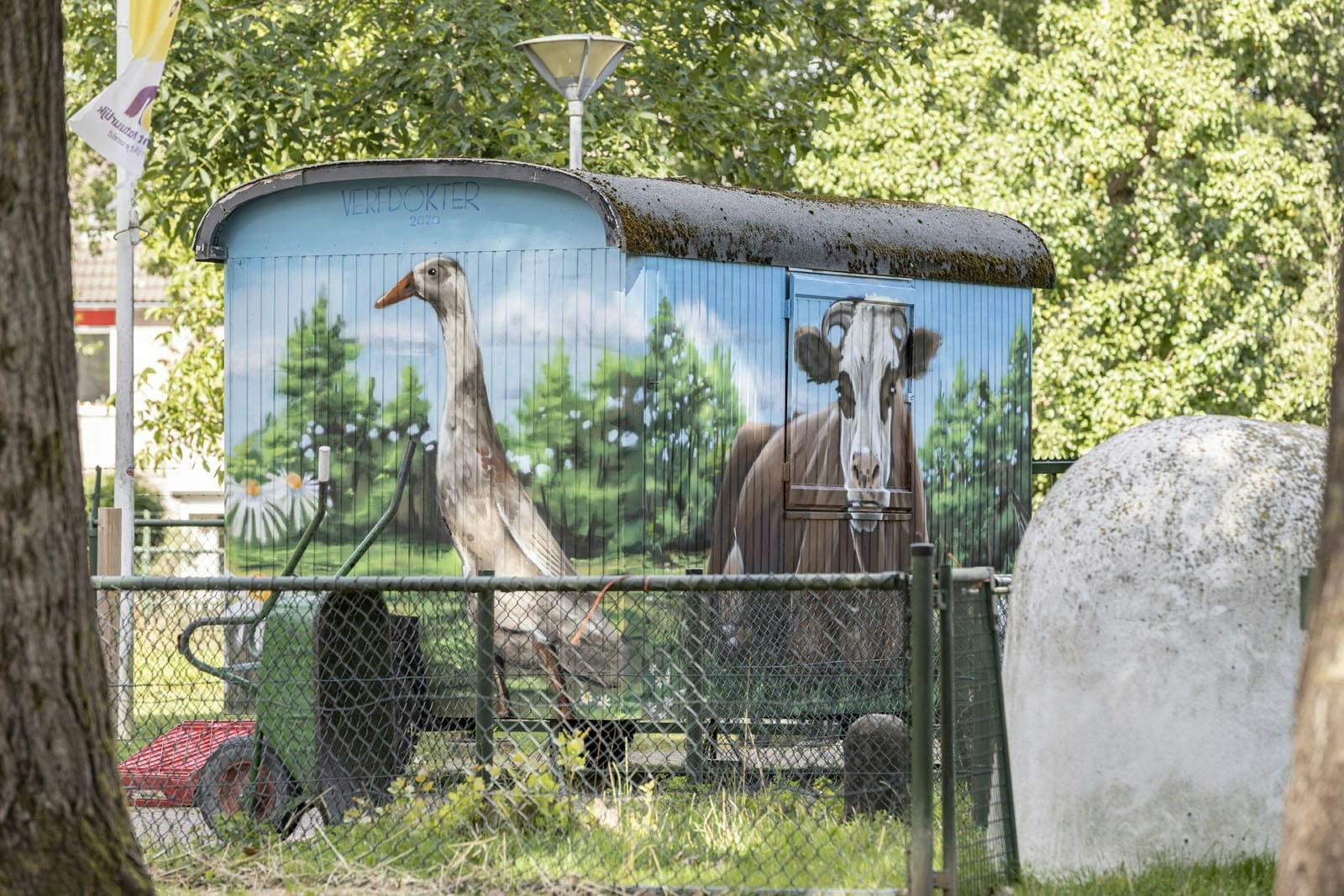 Robert-Jan Brink, beter bekend als Verfdokter, heeft een bouwkeet van Stadsboerderij Koppelsteede in Lunetten opgefleurd. Rondom de keet zijn afbeeldingen van verschillende dieren te zien.