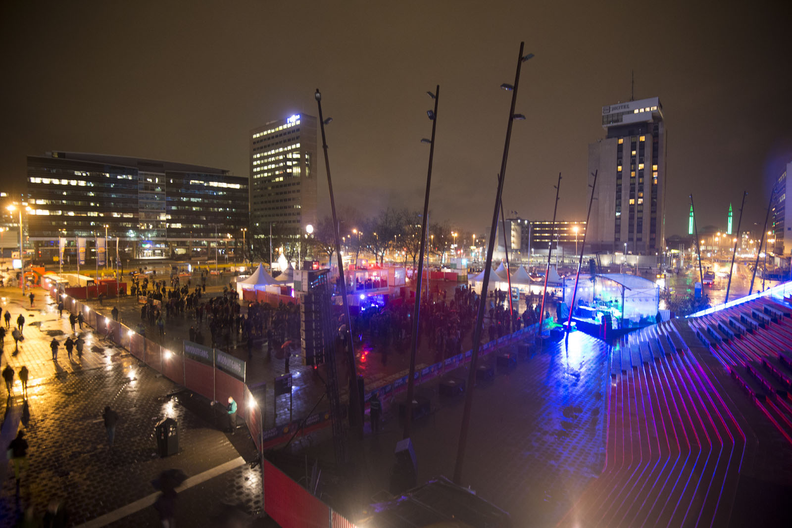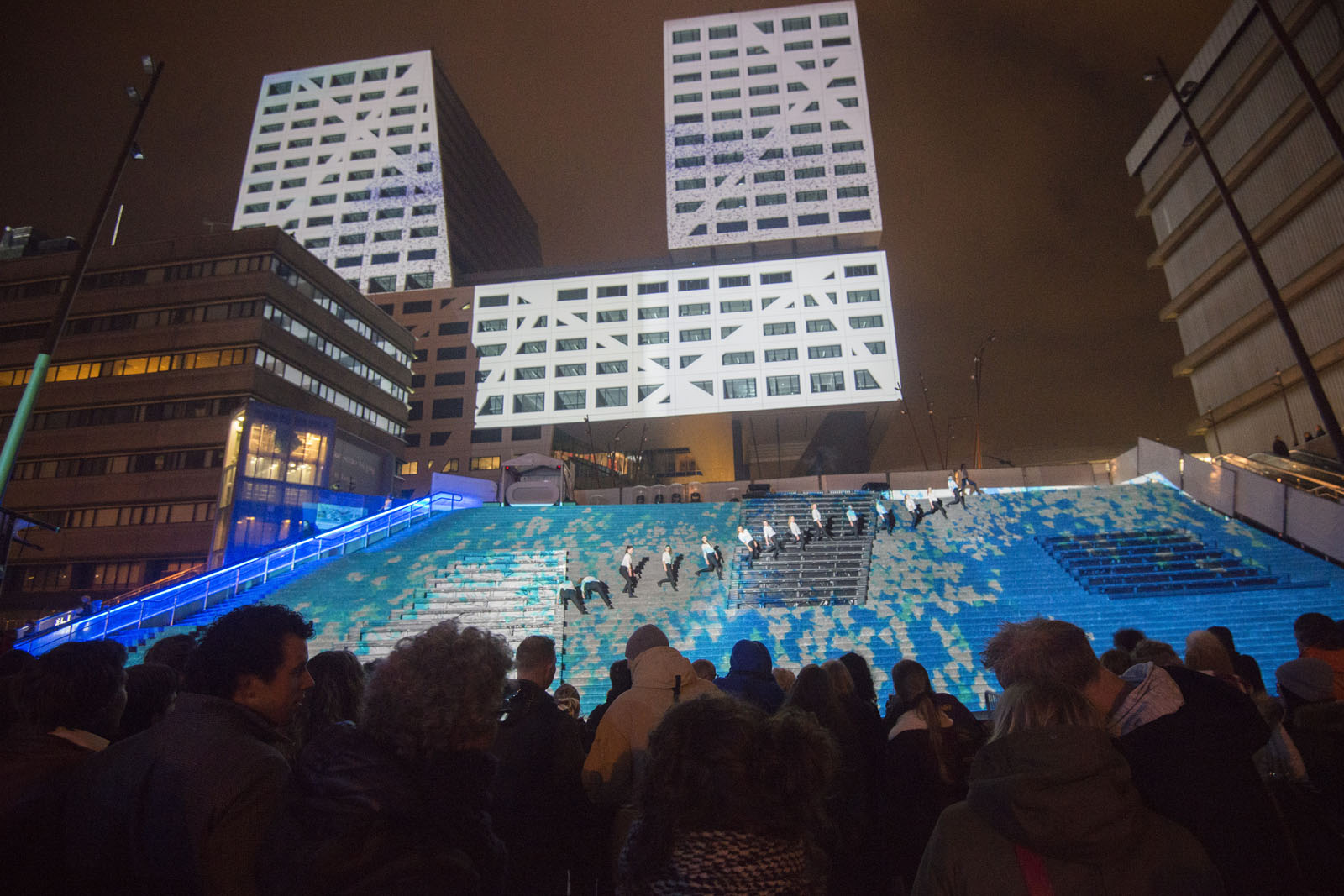 De locatie voor een show is perfect, zowel de brede trappen als het Stadkantoor vormen een ideaal vlak.