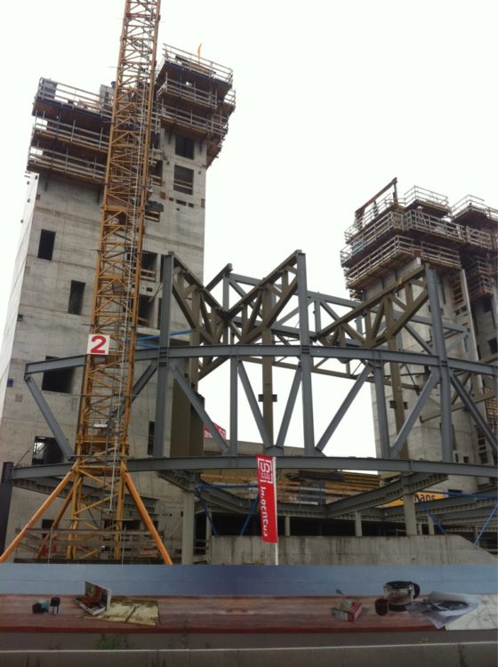 Pannenbier op de bouwplek, een geanimeerde borrel in het informatiecentrum. Woensdag werd het hoogste punt van het nieuwe Muziekpaleis bereikt en dat was reden voor tevredenheid bij de direct betrokkenen.