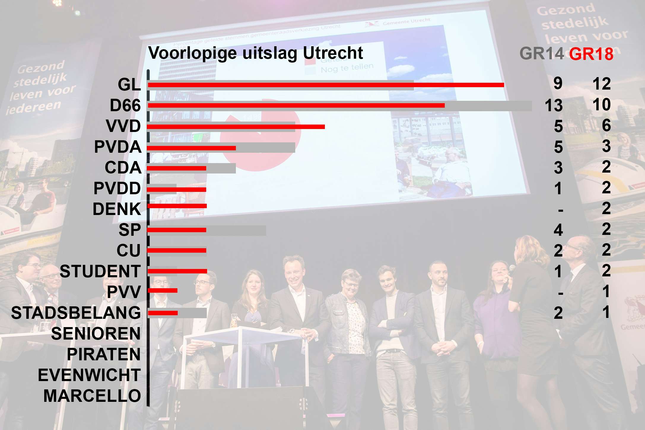 Het aantal GroenLinks stemmers in Utrecht steeg met meer dan 6 procent ten opzichte van de gemeenteraadsverkiezingen vier jaar geleden. Ook in andere grote steden, waaronder Amsterdam, werd GroenLinks de grootste partij.