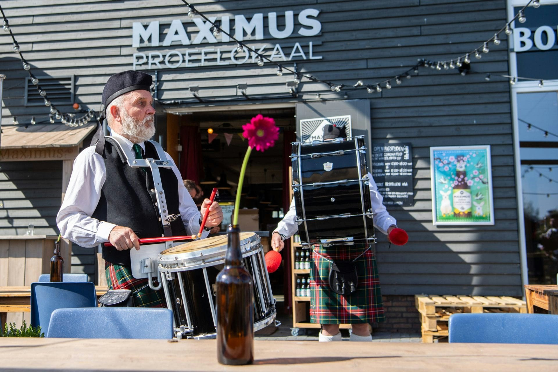Als laatste detail werden vandaag veilige ‘Schotten’ tussen de terrastafels aangebracht. Het was een actie met een knipoog, want het ging om Schotten van de Saint Anthony Pipe Band uit Wijk bij Duurstede, voor de gelegenheid in vol ornaat met kilt en doedelzak, die een kort concert ten gehore brachten.