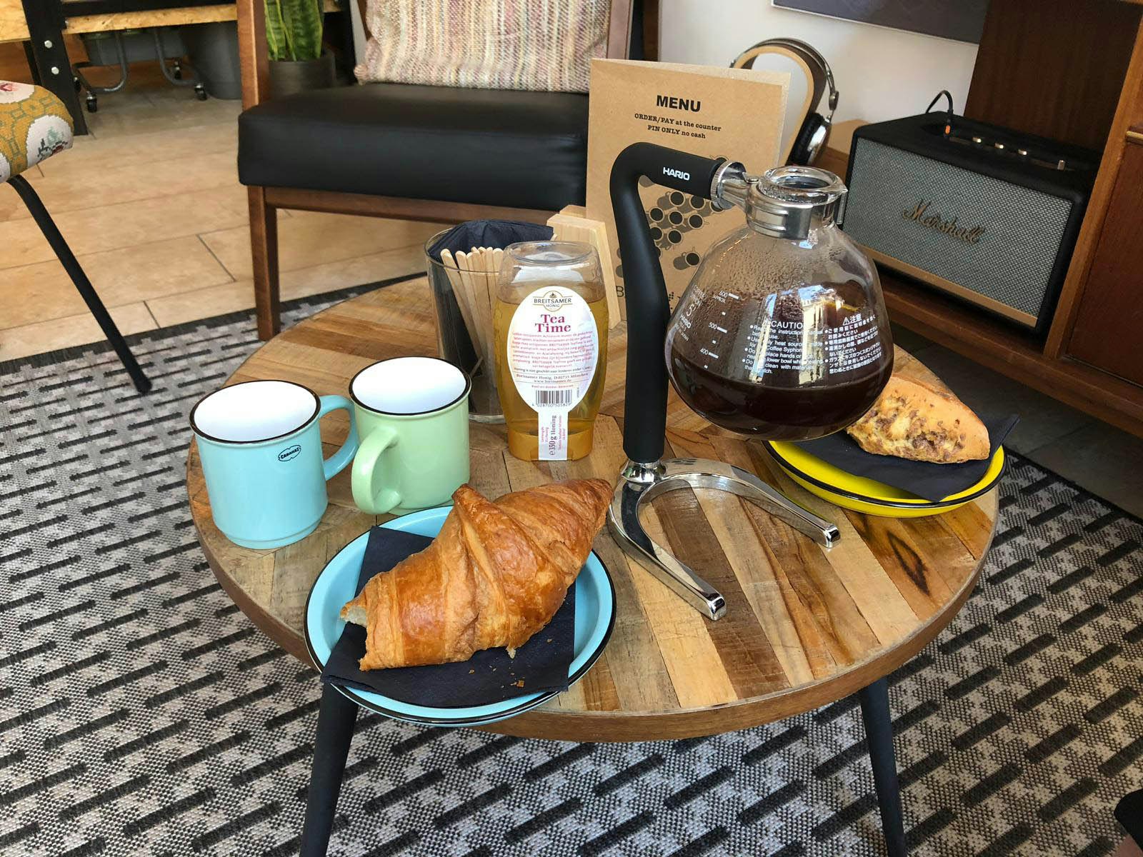Ons oog valt meteen op vier speciale koffiezetters, die bovenop de vitrine staan te pronken. We kennen het niet, maar eigenaar Rob legt uit dat deze ‘Syphons’ veel worden gebruikt in Japan. De Syphon bestaat uit een houder waar een glazen kannetje onder hangt. Daarboven klik je een koffiefilterhouder vast. Onder het glazen kannetje zet je vervolgens een hallogeenbrander aan die het water doet koken. Het water borrelt omhoog langs de koffie, en druppelt ook weer terug het kannetje in, terwijl de koffiedrab in het filter achterblijft. Ingenieus!