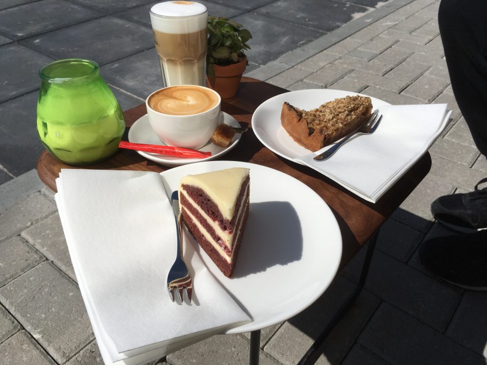 Hoewel de lunchkaart verleidelijk lonkt met veelbelovend lekkers, houden we het bij een steekproef van de zoetigheden vandaag. De uitverkorenen: appel-rabarbercrumble en een heuse red velvet cake. De eerste is heerlijk; de combinatie van fris-zuur en zoet is erg goed gelukt en levert een origineel taartje op. De red velvet cake is al net zo speciaal: deze roze-wit gestreepte taart smaakt naar bosbessen en witte chocolade. Goed vullend, maar ook in balans.
