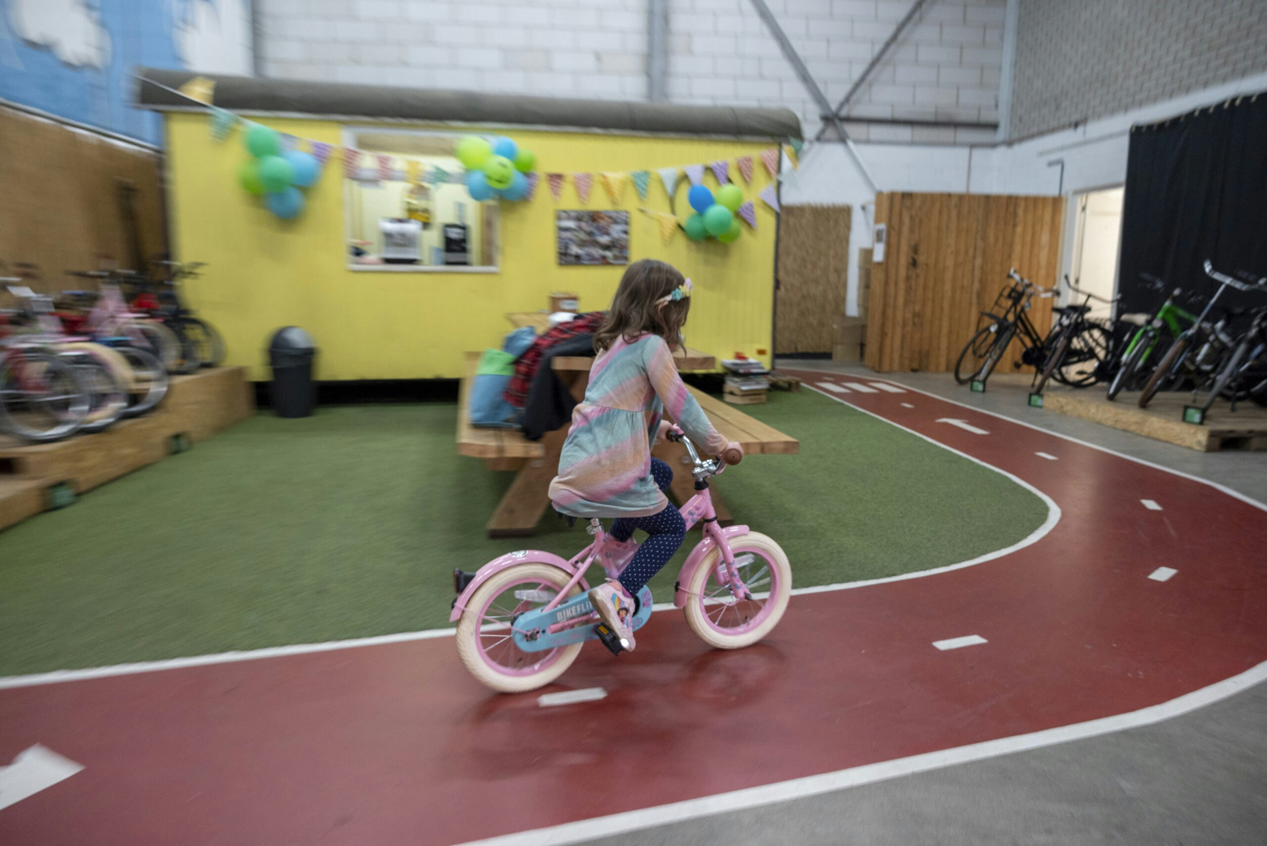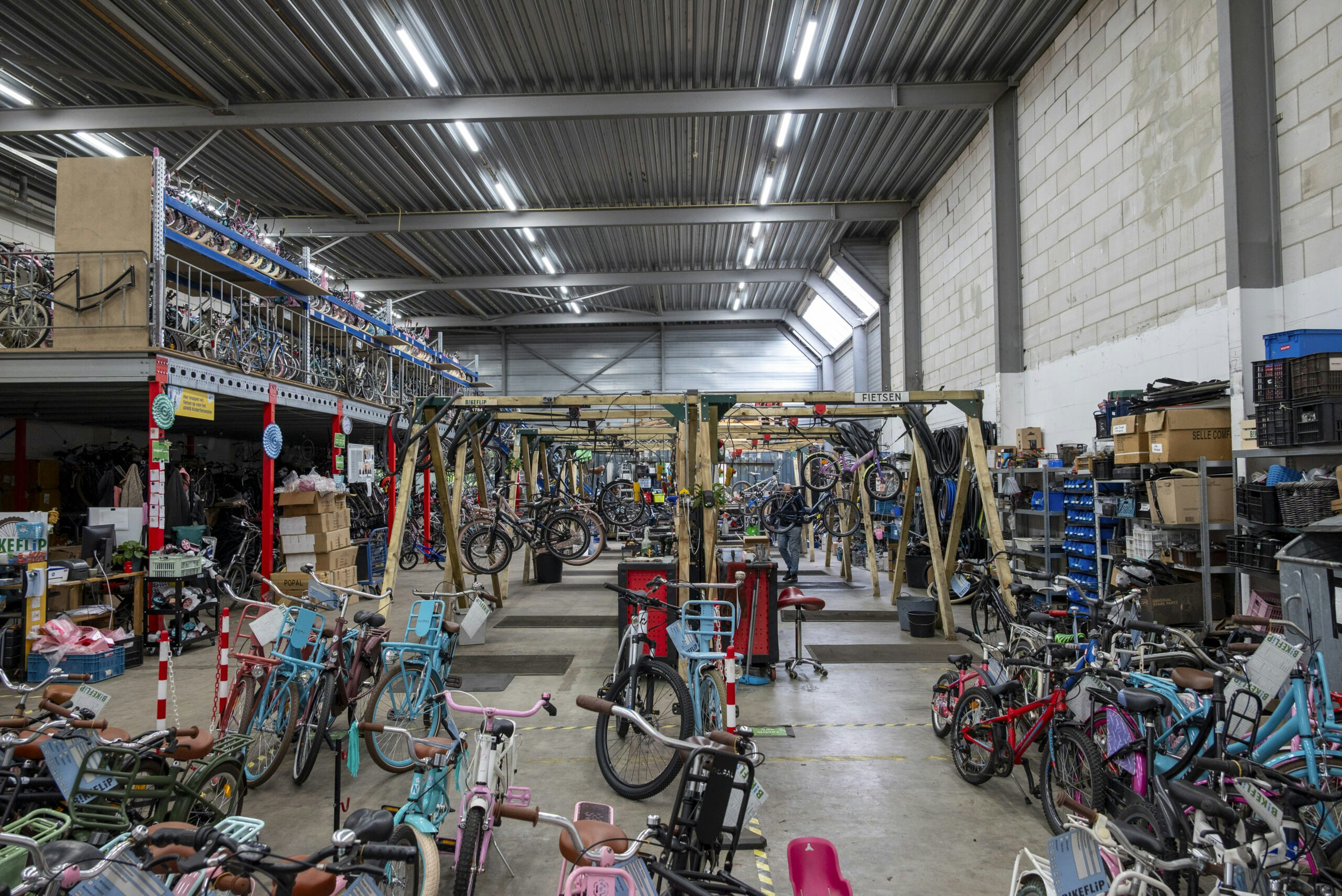 “Er staan hier nu ongeveer 900 fietsen”, schat Cas in. Ze staan keurig geordend. “Beneden komen de fietsen binnen”, legt Paul uit. “In onze werkplaats worden ze opgeknapt, getest en dan rijden we ze weer de deur uit.” Ondertussen maakt een van de fietsenmakers een testritje door het pand op een knalgele kinderfiets. “Alle fietsen die weer ingeruild worden, checken we opnieuw.”