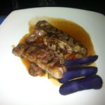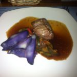 Tijd voor een stuk vlees. Klein portie lamskoteletjes bestaat uit twee stukjes slecht gebakken vlees met een te verwaarlozen netto-opbrengst. Veel snijden en weinig eten, dus. Veel beter is het gesteld met de tournedos (alleen verkrijgbaar als groot gerecht). Voortreffelijk stuk vlees, prima gebakken, geleverd met zeer smakelijke truffelaardappelen.