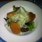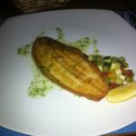 Vervolgens een salade van gemarineerde venkel met licht gerookte coquilles. De salade is een gemakzuchtig hoopje sla waarin de venkel niet te vinden is, coquilles zijn precies goed. We gaan verder met vis. Aan beide kanten van de tafel worden twee slibtongetjes (5,50 euro per stuk) met een frisse salade geserveerd. Een aardig visje, meer valt er ook niet over te zeggen.