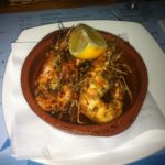 Maar liefst twaalf visgerechten, vier vlees en drie “Vis noch vlees.” Keuze genoeg. Veel gerechten zijn ook in kleine porties te krijgen en dat vinden we absoluut een pluspunt. We beginnen met een grote portie Gamba’s Pil Pil. Een bordje extra en we genieten met zijn tweeën van garnalen in pikante knoflookolie. Een lekker begin, al is het jammer dat er geen schaaltje water of doekje bij wordt gezet.