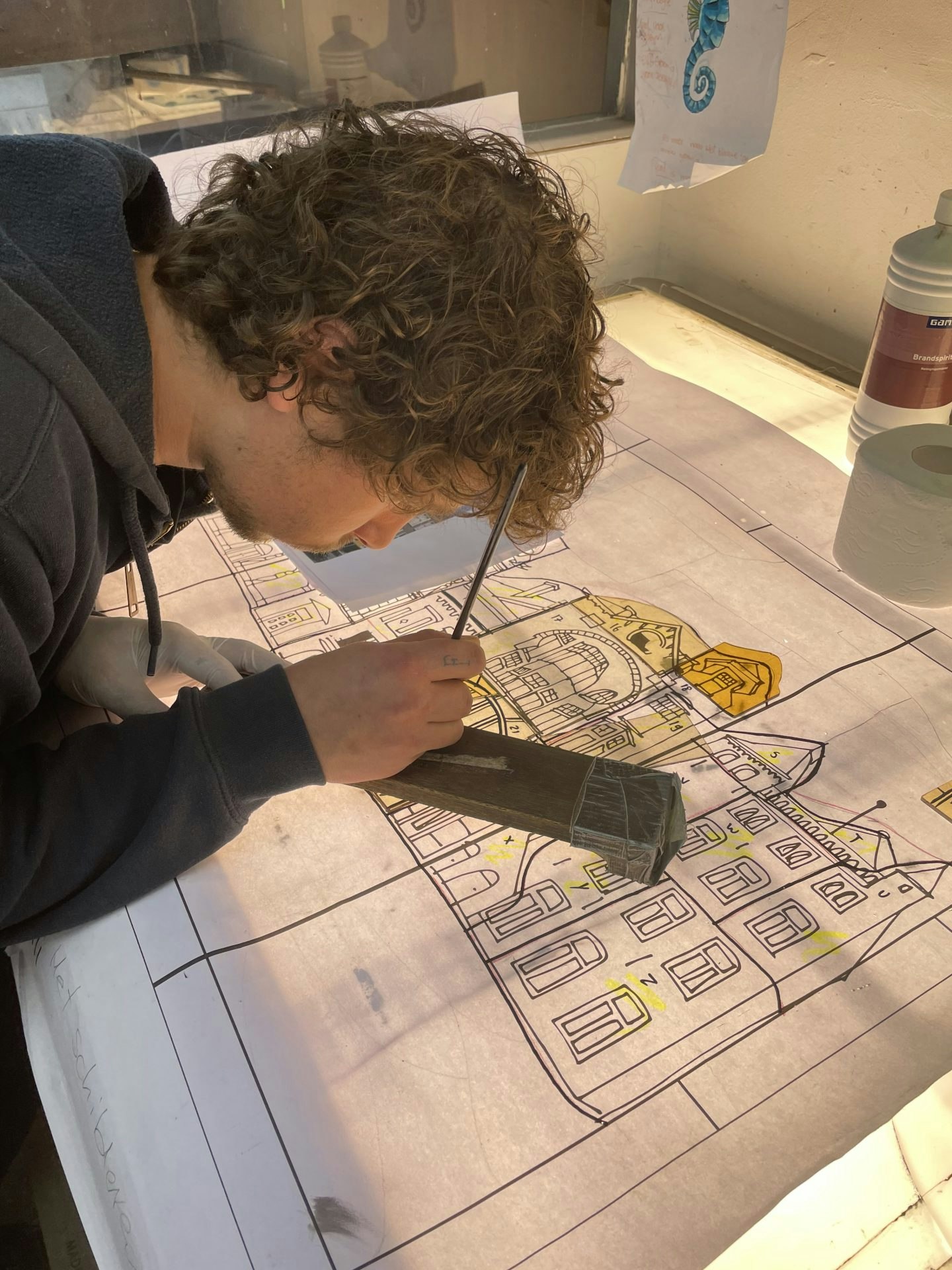 Ook Bram van Roessel maakt glas-in-loodcreaties bij Heart Glass. Hij is in het tweede deel van het atelier bezig met een glas-in-loodskyline van Utrecht. “Dit maken we voor een particulier”, legt Van Roessel uit. “Van links naar rechts zie je het Muntgebouw, de Winkel van Sinkel, Apotheek De Liefde en Stadskasteel Oudaen. Ja, de Domtoren ontbreekt, maar het is misschien ook wel cliché om hem altijd te gebruiken in een skyline van de stad.”