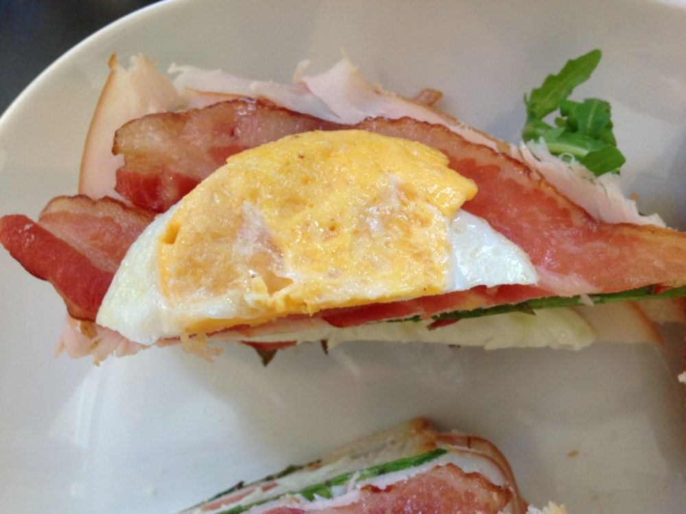 Na niet al te lang wachten zie ik mijn CS uit de keuken komen en wordt deze voor me op tafel gezet. In eerste instantie ben ik niet laaiend enthousiast. Alles zit erop hoor, gerookte kip, krokant spek en een gebakken eitje. Op de sla, die ernaast ligt, na ziet de CS er niet vlammend uit. Het ontleden begint. De twee lagen beleg zijn identiek aan elkaar. Dun laagje mayo, laagje sla, laagje kip, krokant spek en een gebakken eitje op geroosterd brood. Mijn hoop doet weer herleven als blijkt dat het eitje goed is gebakken. Geen zwarte randjes of vettigheid, maar een keurig net gebakken ei. Ik mis wel de friet.