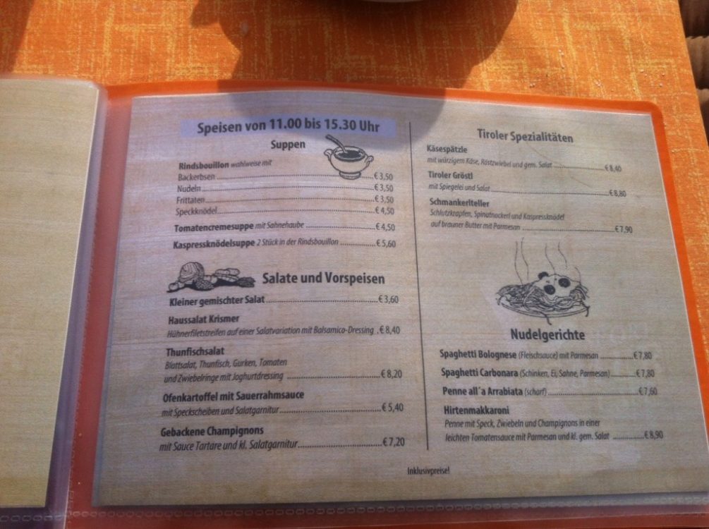 Na lang skiën kwamen we terecht bij Cafe-Restaurant Krismer, niet ‘De’ après-ski hut van Fiss, dat is zonder meer Hexenalm (www.hexenalm.at), maar echt een strategisch handig gelegen lunchplek zo aan het begin van de piste als je even geen pasta wil nuttigen op de berg.
